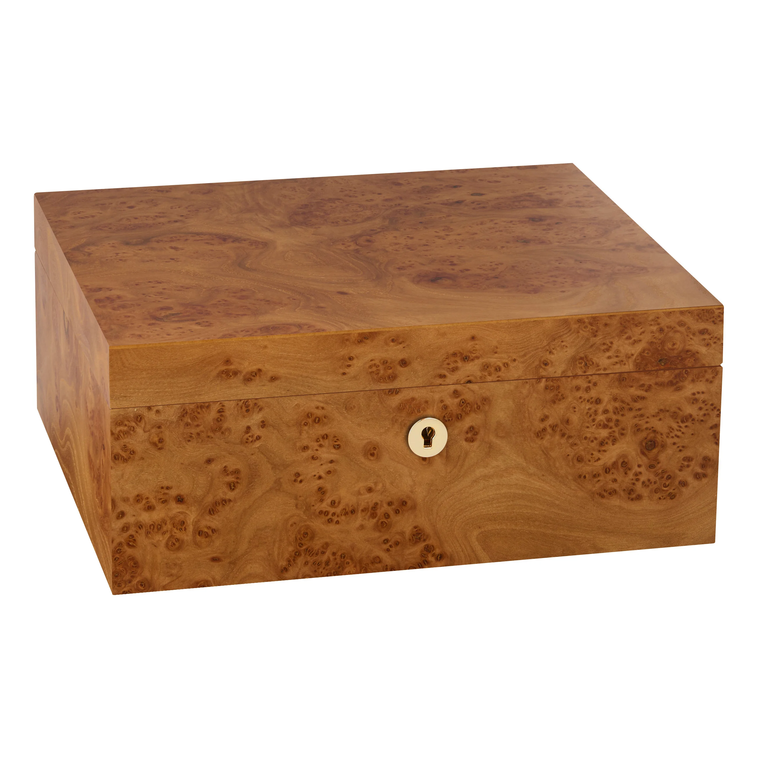 Das Ulmenholz überzeugt durch seine charakteristische Maserung mit warmbraunen bis dunkelbraunen Farbtönen, durchzogen von markanten Maserknollen, die man auch Augen nennt. Dank seiner warmen und natürlichen Ausstrahlung fügt sich der Humidor harmonisch in nahezu jedes Ambiente ein. Humidore der Größe Medium fassen bis zu 75 Zigarren und bieten damit ausreichend Platz für Ihre Zigarrensammlung.
