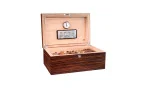adorini Humidor Ebenholz Basic L Der moderne und funktionale Humidor der Marke adorini aus der Serie Basic in der Größe L überzeugt mit seiner matten Ebenholz Oberfläche und Vielseitigkeit. Mit Platz für ca. 150 Zigarren oder auch kleinere Zigarrenkisten bietet er eine ideale Lösung für die sichere Lagerung Ihrer Zigarren. Im Lieferumfang sind ein analoges Hygrometer und ein passiver Schwammbefeuchter enthalten. Das Hygrometer misst die Luftfeuchtigkeit auf Basis einer Metallspirale und wird zusammen mit dem Befeuchter magnetisch und flexibel im Deckel des Humidors befestigt. Außerdem ist der Humidor zum Schutz vor fremden Zugriff mit einem Schloss ausgestattet. Im Zubehör ist ein doppelter Schlüsselsatz sodass Sie über einen Ersatzschlüssel verfügen. Der Humidor besitzt matt silberne Scharniere im Innenraum und eine besonders starke Dichtungslippe, die für den optimalen Erhalt der Luftfeuchtigkeit sorgt. Ein vertikaler Divider ermöglicht zusätzliche Unterteilung des Innenraums. Eine zusätzliche und herausnehmbare Etagere organisiert den Humidor auf ästhetische und Funktionale Art und Weise. Es ist herausnehmbar und ist mit Ventilationsrillen ausgestattet für die optimale Zirkulation der Luftfeuchte.