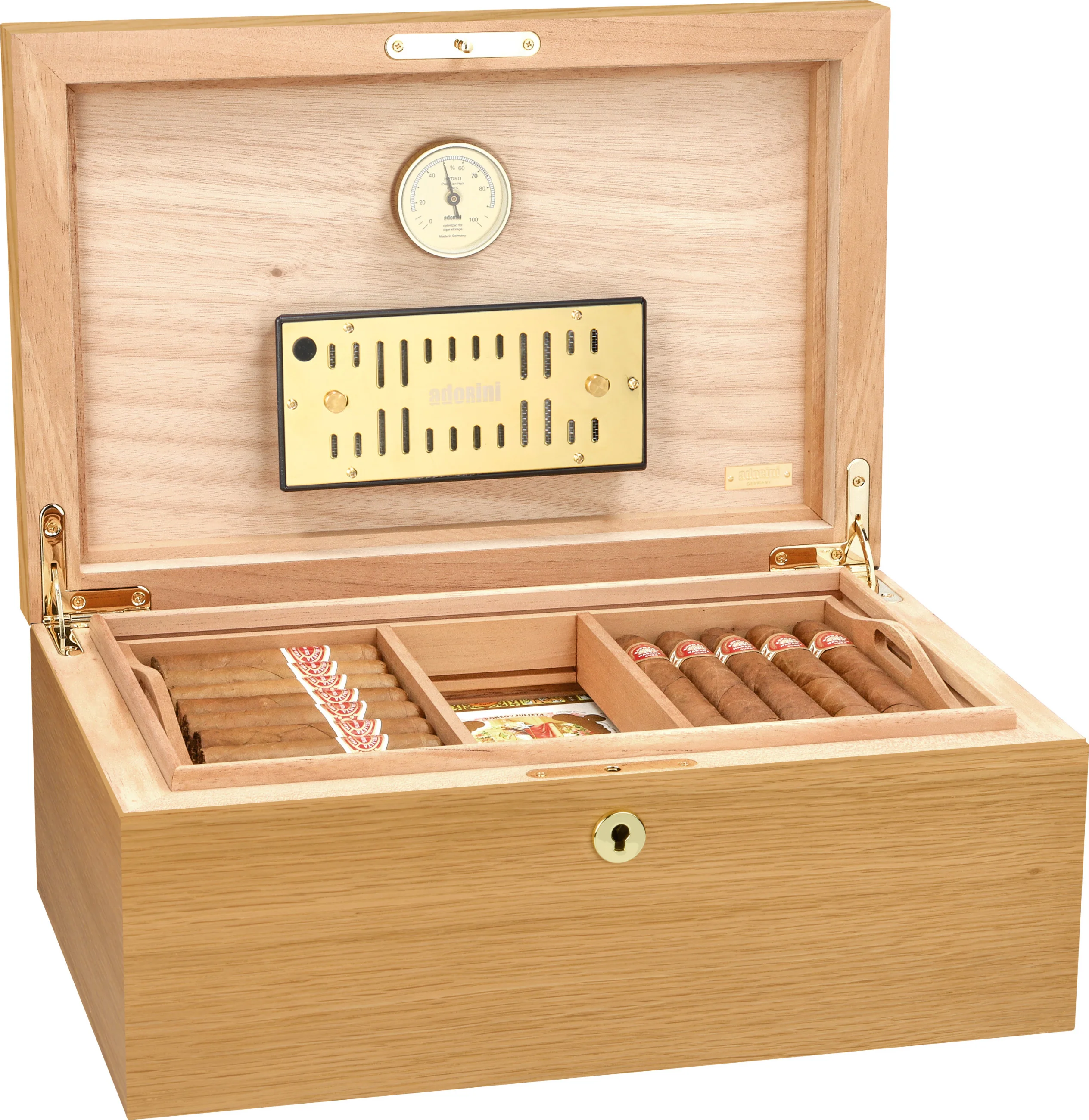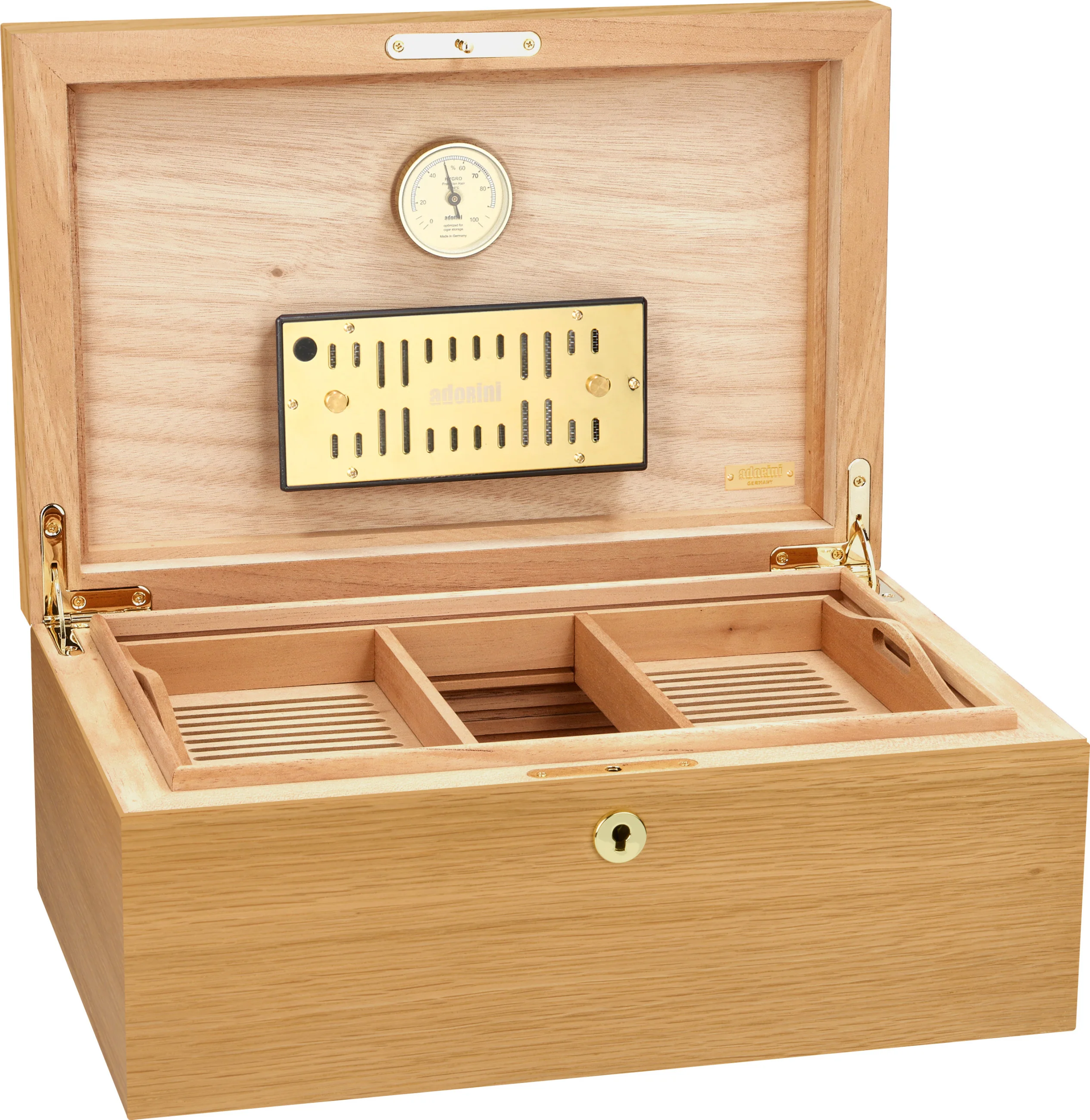 Das Modell Eichenholz besticht durch einen hell-beigen Farbton mit unaufdringlicher Maserung und wirkt dadurch besonders edel und fügt sich hervorragend in jedes Ambiente ein. Die Humidore der Größe Grande fassen bis zu 150 Zigarren und bieten damit viel Platz für die Sammlung anspruchsvoller Genießer.