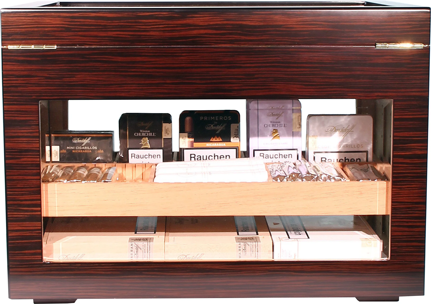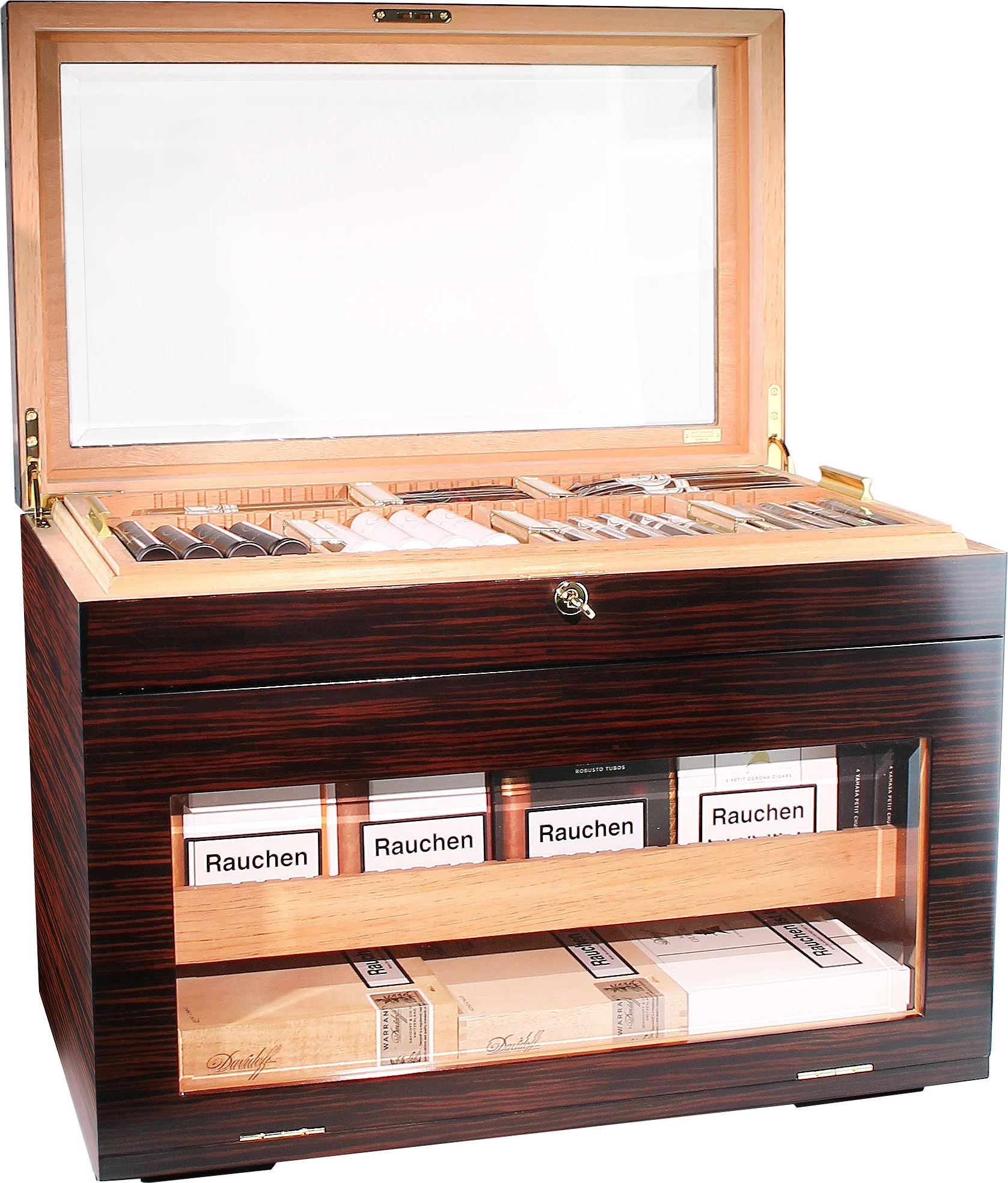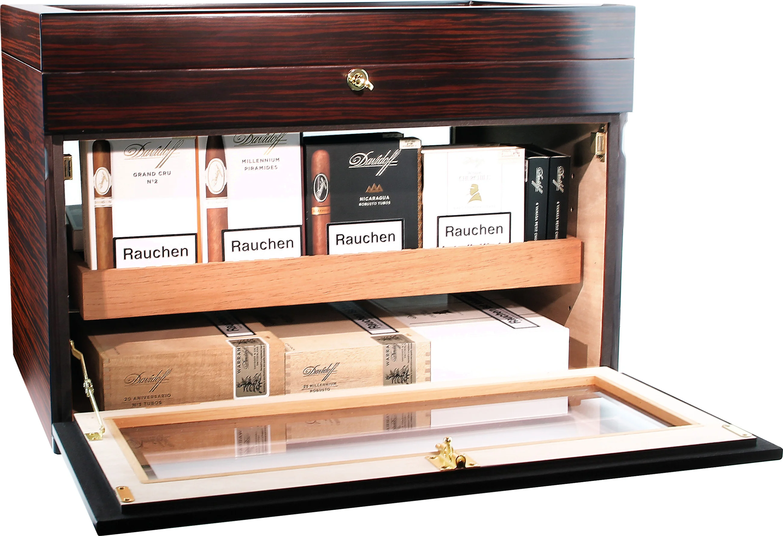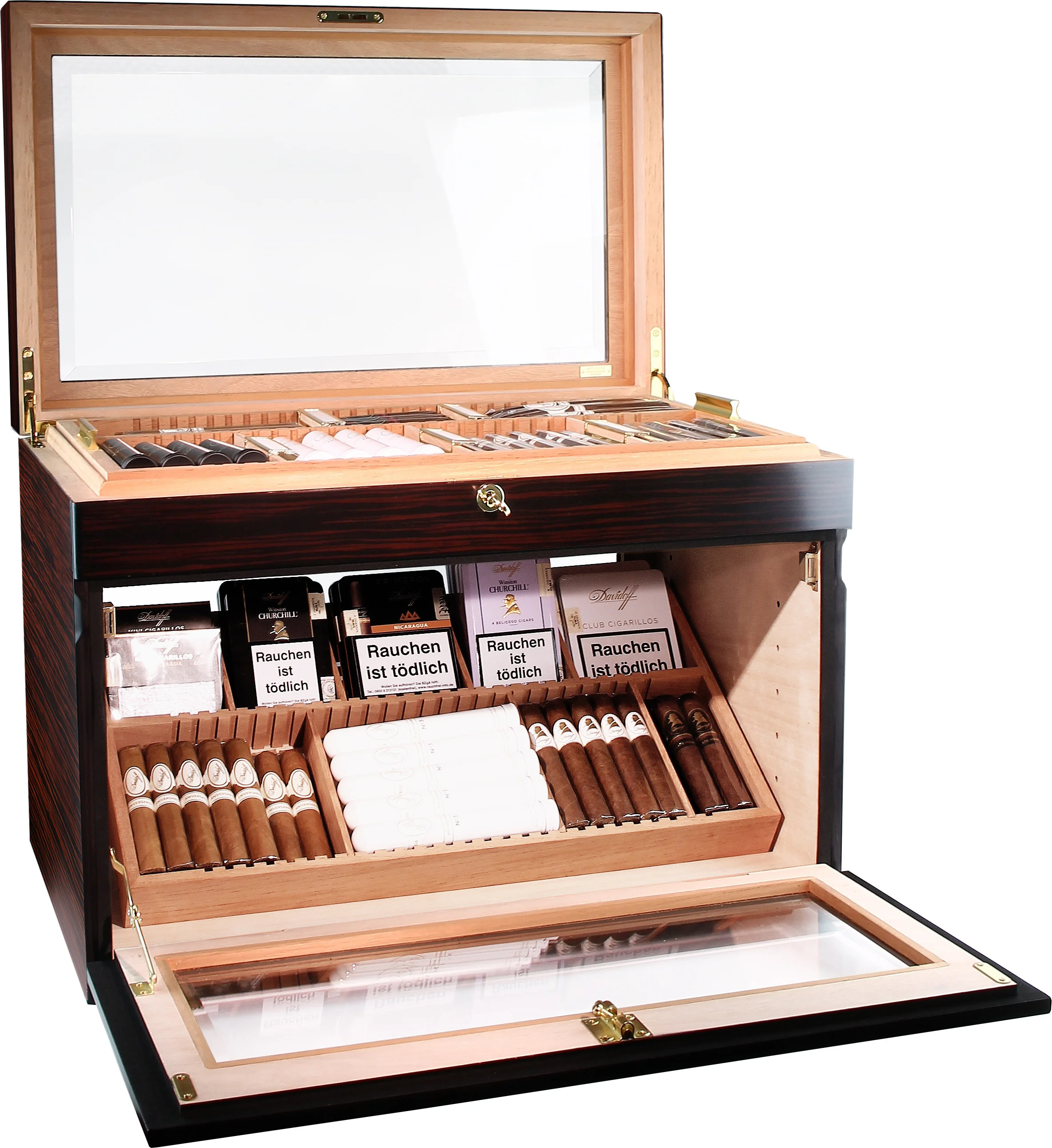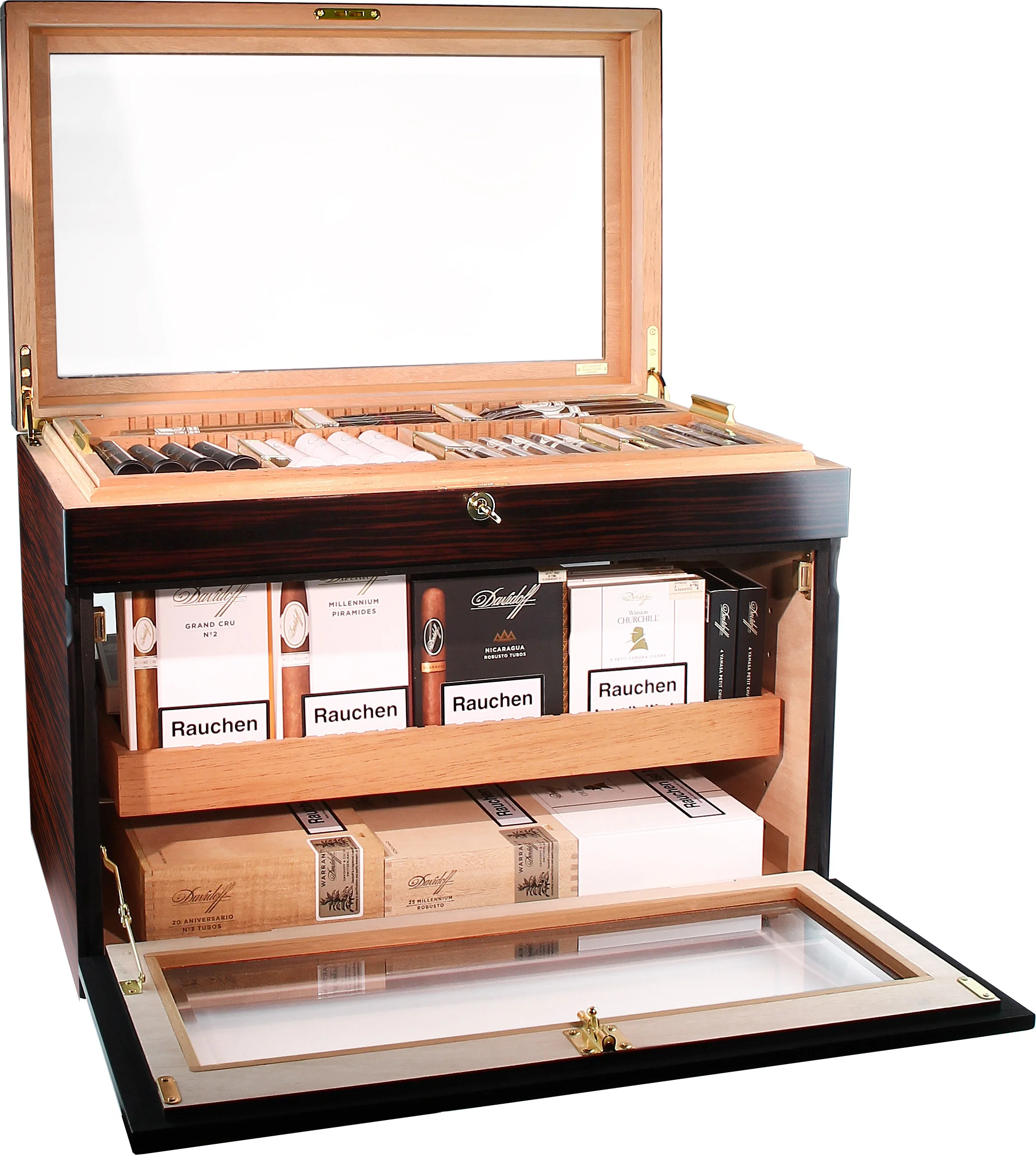 Auf mehreren Ebenen lassen sich einzelne Zigarren, Schachteln oder auch ganze Zigarrenkisten lagern. Der Innenraum ist variabel unterteilbar: