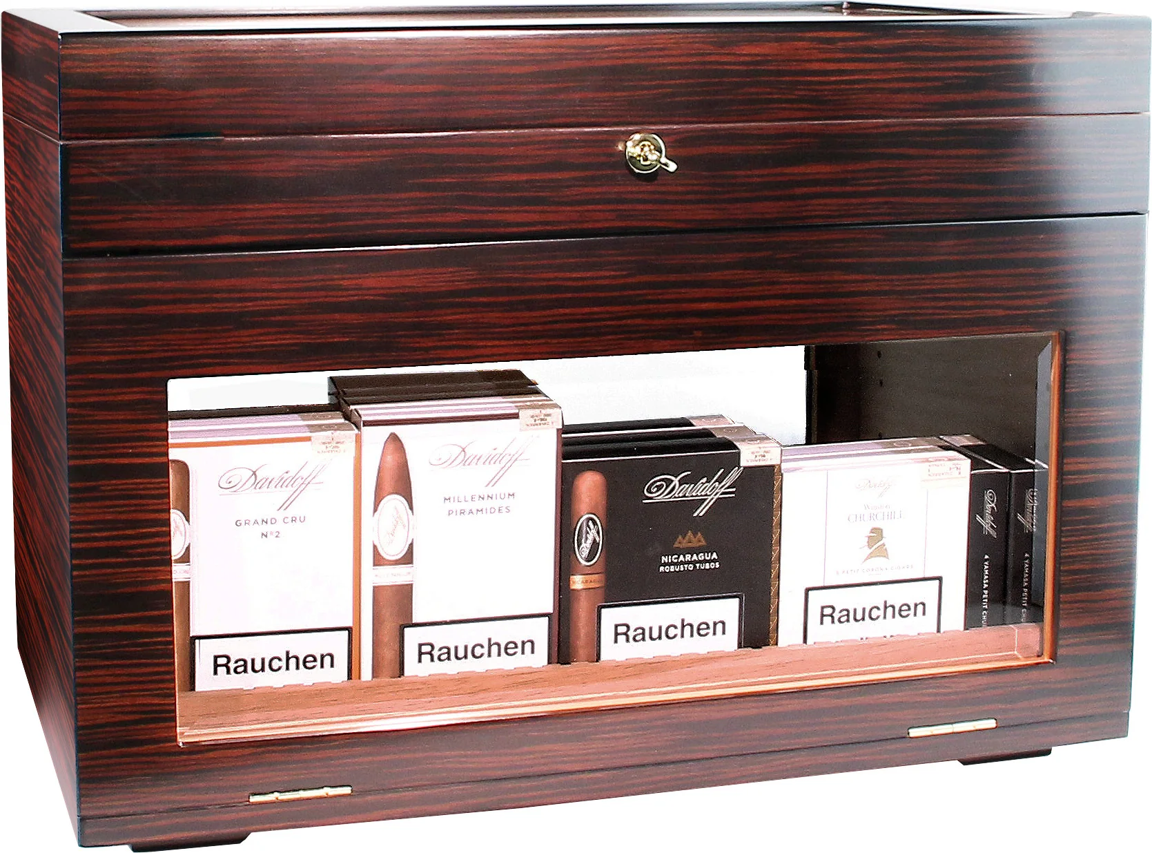 Durch großzügige Glasscheiben auf beiden Seiten ist der Portico von allen Blickwinkeln einsehbar. Damit eignet er sich ideal für Gastronomen, Hotels oder kleinere Fachgeschäfte. Ob auf einer Verkaufstheke oder auf der Bartheke – der Portico zieht sofort alle Blicke auf sich und macht unmissverständlich klar, dass sich hier wahre Schätze für Zigarrenliebhaber verbergen. Erhaben steht er auf eleganten Füßen und unterstreicht so seine edle Erscheinung.