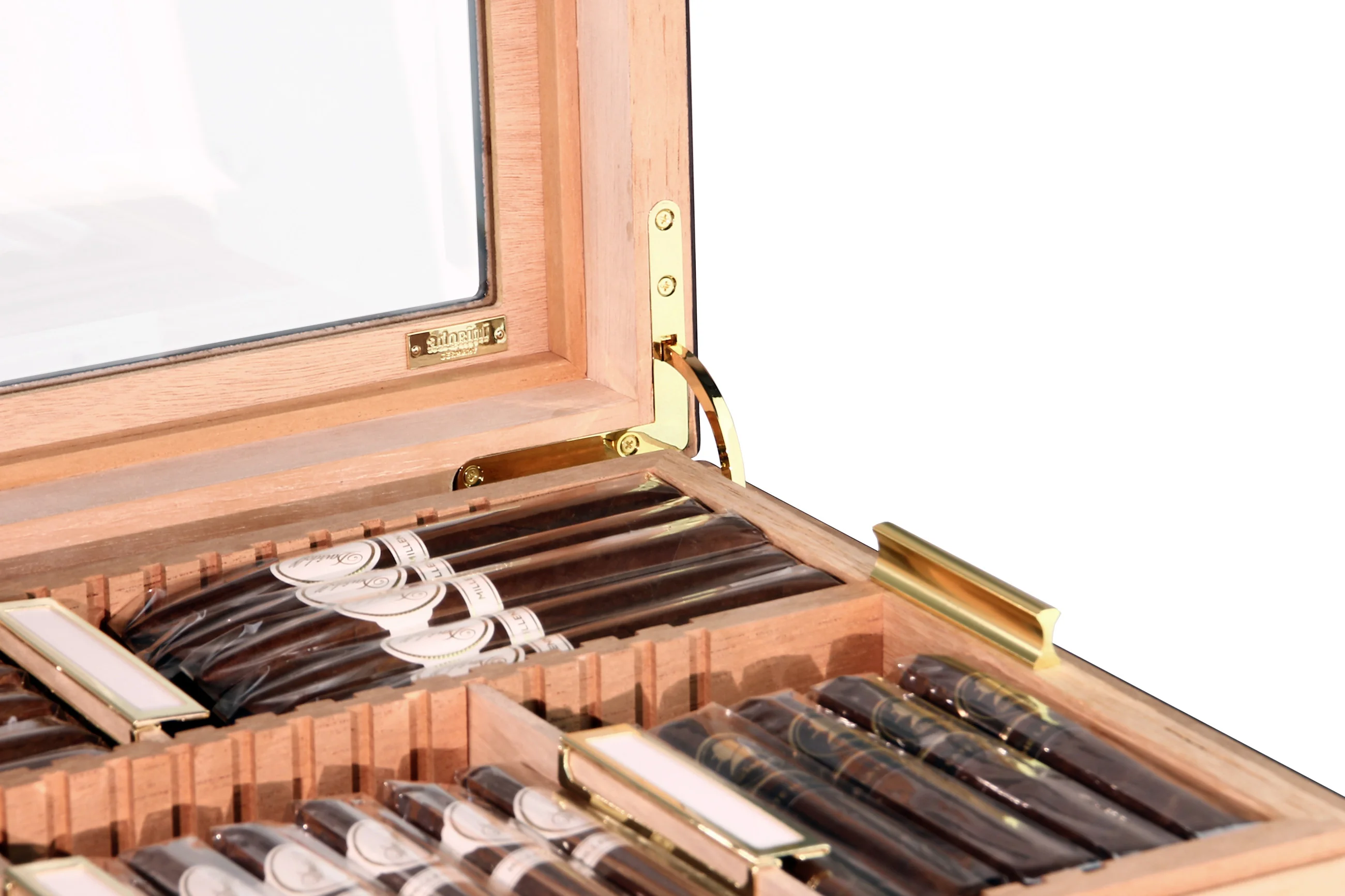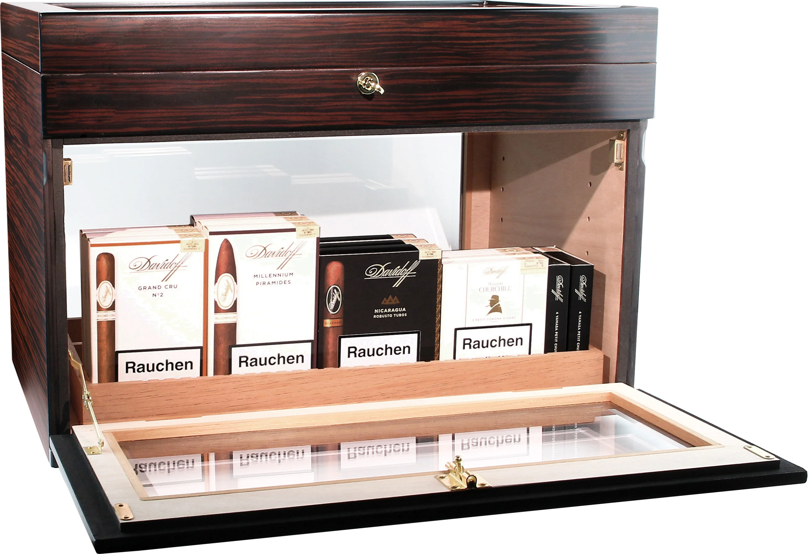 - Trays für Einzelzigarren und Schachteln können eingesetzt und wahlweise angeschrägt platziert werden, um eine optimale Präsentation zu ermöglichen.