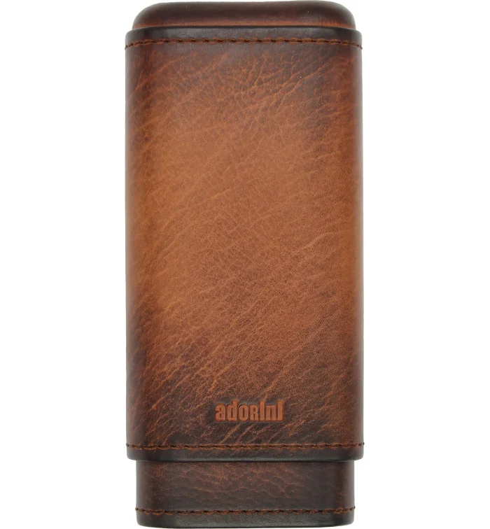 adorini Zigarrenetui Vintage Echt Leder 2-3 Zigarren Braun ist ein zweiteiliges Schiebeetui aus feinstem Echtleder in einem edlen Vintage-Braun. Die warmen Brauntöne und die hochwertige Verarbeitung machen es zu einem stilvollen Accessoire für 2-3 Zigarren unterschiedlicher Formate. Das Etui ist höhenverstellbar und bietet Platz für Zigarren bis zu einem Ringmaß von 63. Innen ist es mit Zedernholz ausgekleidet, um optimale Bedingungen für Ihre Zigarren zu gewährleisten. Ein praktischer, herausnehmbarer Divider aus Zedernholz sorgt dafür, dass eine einzelne Zigarre fest an ihrem Platz bleibt, sodass sie vor dem Hin- und Herrollen geschützt wird und unbeschädigt bleibt. Gleichzeitig kann der Divider zur einfachen Separation mehrerer Zigarren genutzt werden.