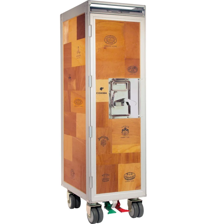 Es handelt sich bei diesem Trolley um einen luxuriösen Originaltrolley, wie man ihn aus der Luftfahrt kennt (Fabrikneu vom Airline-Ausstatter, exklusiv veredelt in Deutschland durch adorini), furniert mit echten Zedernholzblättern aus Original Habanos-Kisten und anschließend versiegelt.