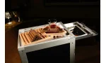 Das Außenmaterial besteht aus schwarzem Holzfurnier, das mit seinem tiefdunklen Glanz edel mit dem silberfarbenen Aluminiumkorpus kontrastiert. Jeder Trolley ist ein handgefertigtes Einzelstück – ein Statement für Zigarrenliebhaber mit Anspruch an Ästhetik und Qualität.ybr> Hochwertige Innenausstattung für perfekte Lagerung Im Inneren ist der Trolley mit hochwertigem Okume-Holz ausgekleidet, das sich durch seine feuchtigkeitsresistenten Eigenschaften auszeichnet – ideal für die Lagerung von Zigarren. Zwei Ebenen bieten flexiblen Stauraum für Kisten oder Einzelzigarren, während eine separat geführte Aluminium-Schublade im unteren Bereich Platz für Zubehör oder Flaschen bereithält.