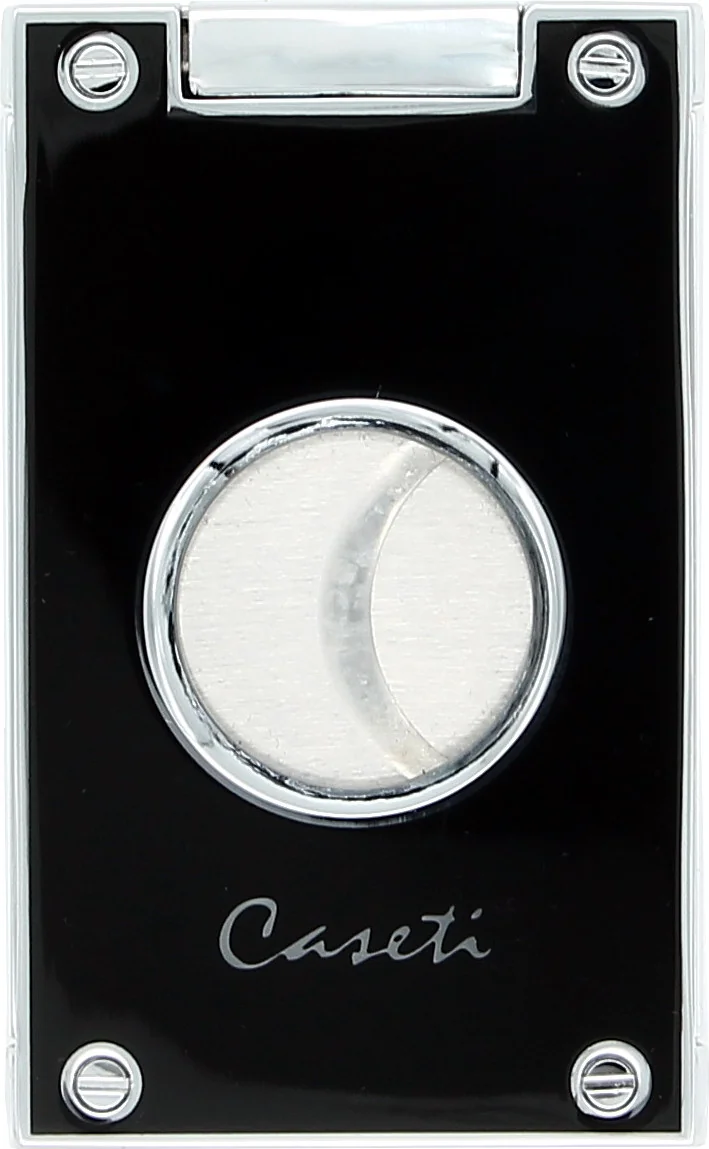 Diese luxuriöse Kreation ist schwarz lackiert und verchromt und mit einem geschmackvollen Caseti-Logo verziert. Das zeigt, dass Sie ein Zigarrenliebhaber mit tadellosem Geschmack sind. Die rechteckige Form verleiht dem Cutter einen Hauch von Eleganz und macht ihn perfekt für die formellsten Anlässe.