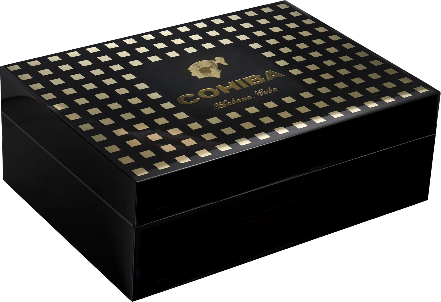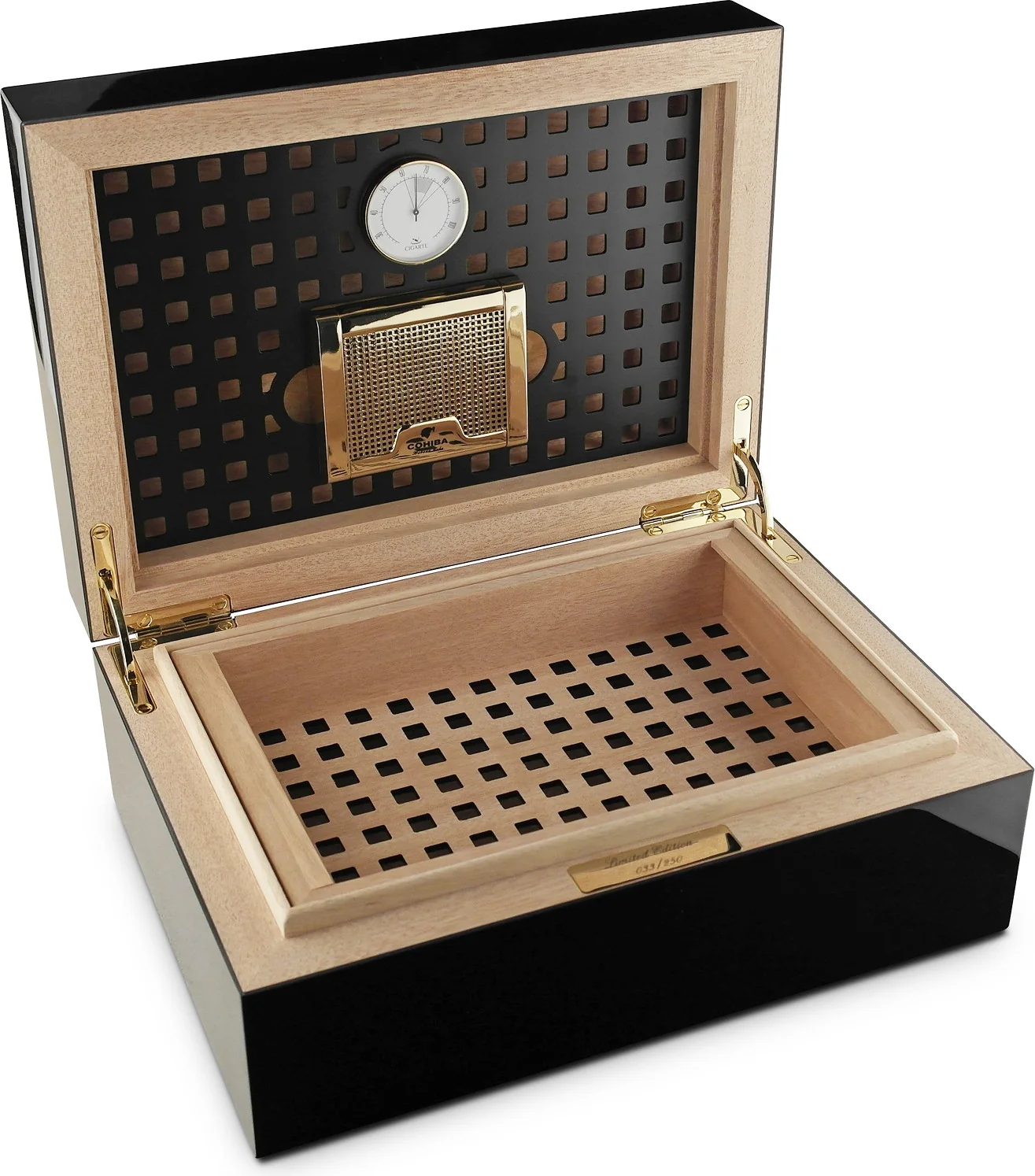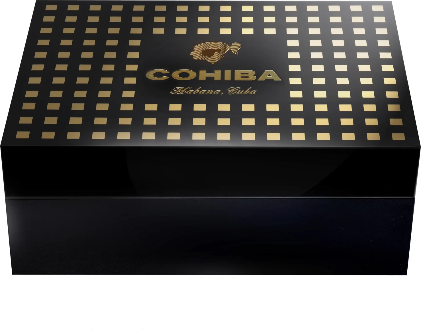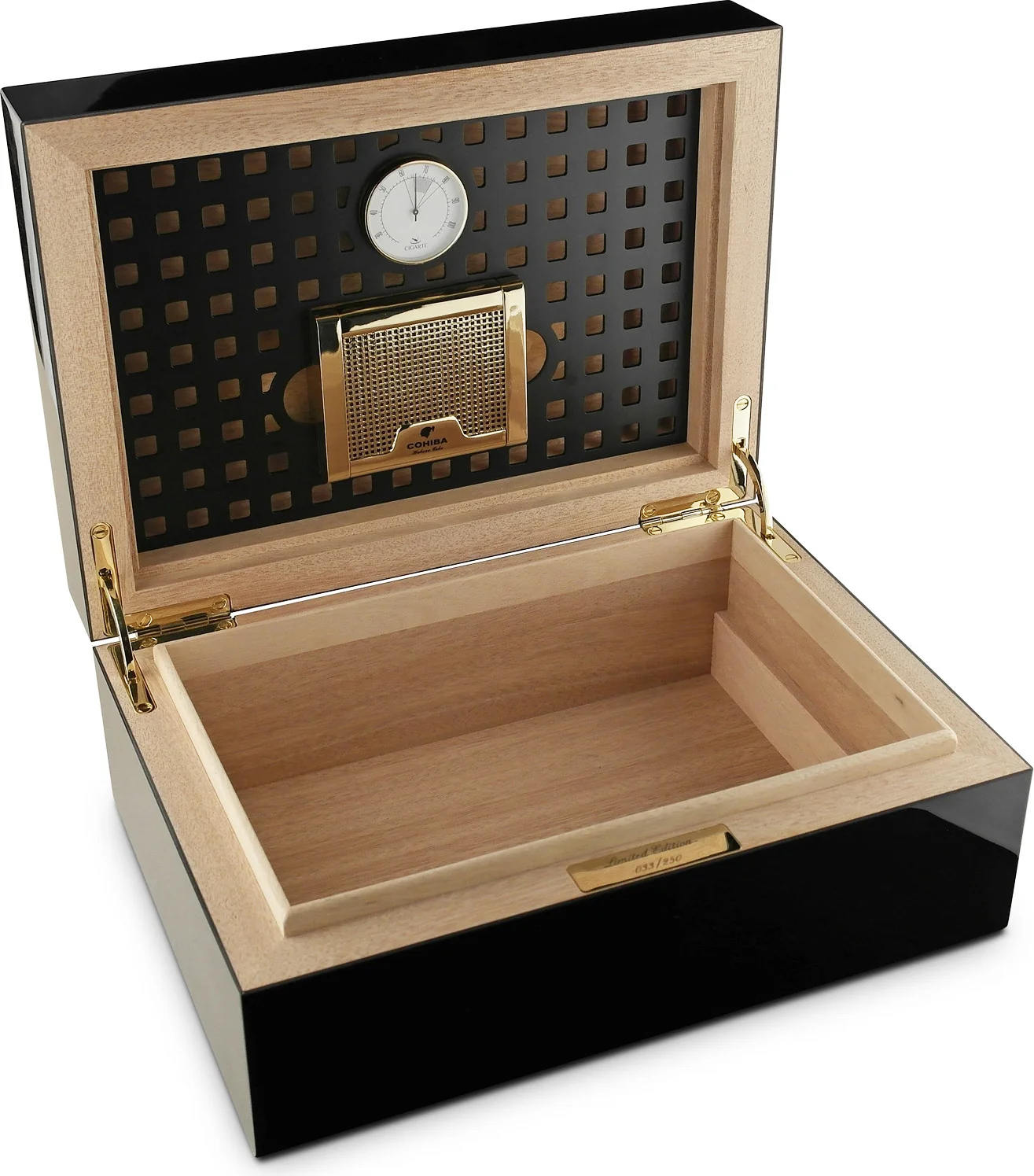 Der Humidor präsentiert sich in hochglänzendem Schwarz mit einer Oberfläche, die an edlen Klavierlack erinnert. Markentypische goldene Elemente setzen elegante Akzente. Zentral auf dem Deckel befindet sich das berühmte Cohiba Markenlogo. Nach dem Öffnen zeigen sich hochwertige goldene Scharniere sowie eine Plakette, die Auskunft über die individuelle Limitierungsnummer gibt.