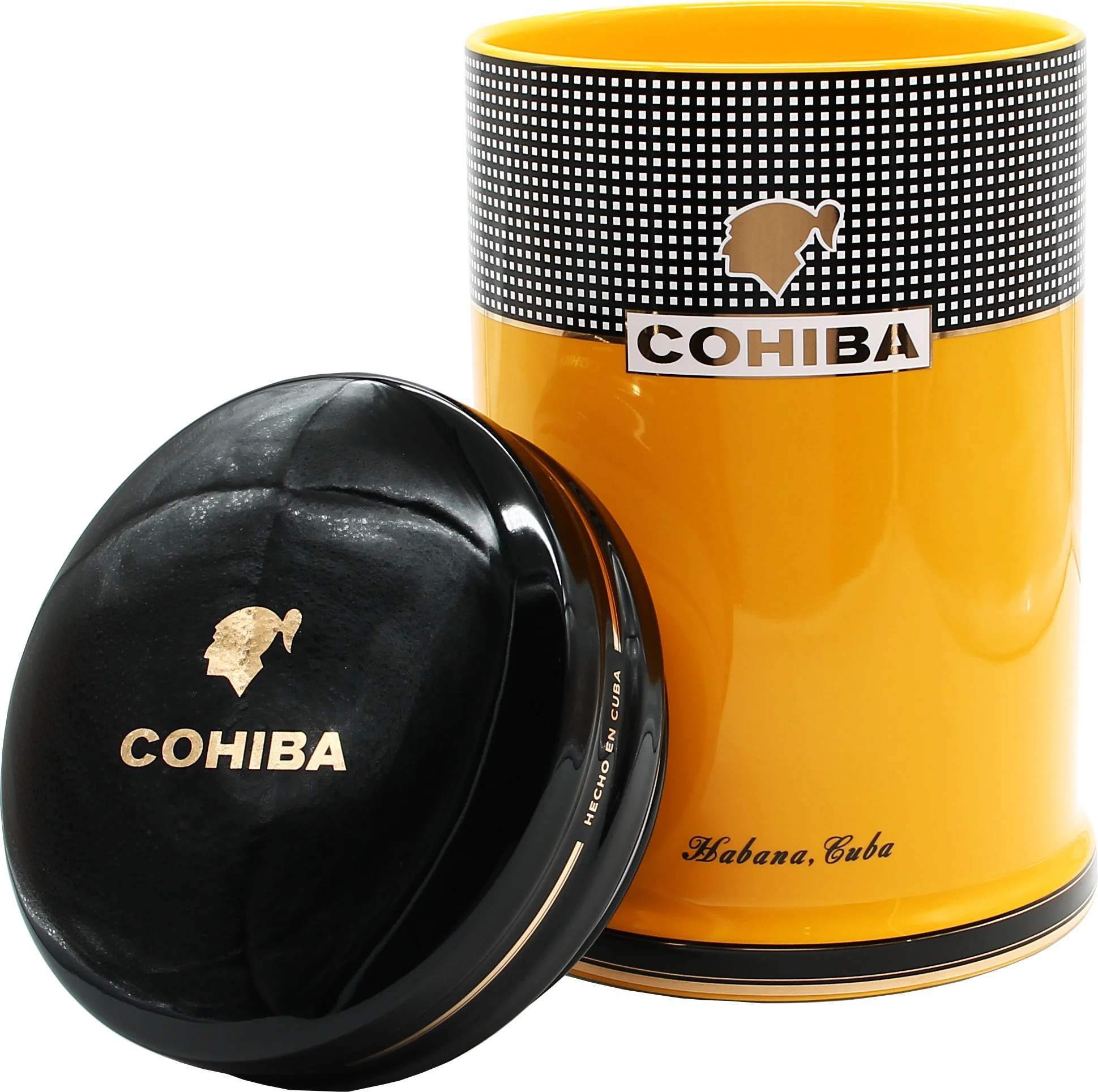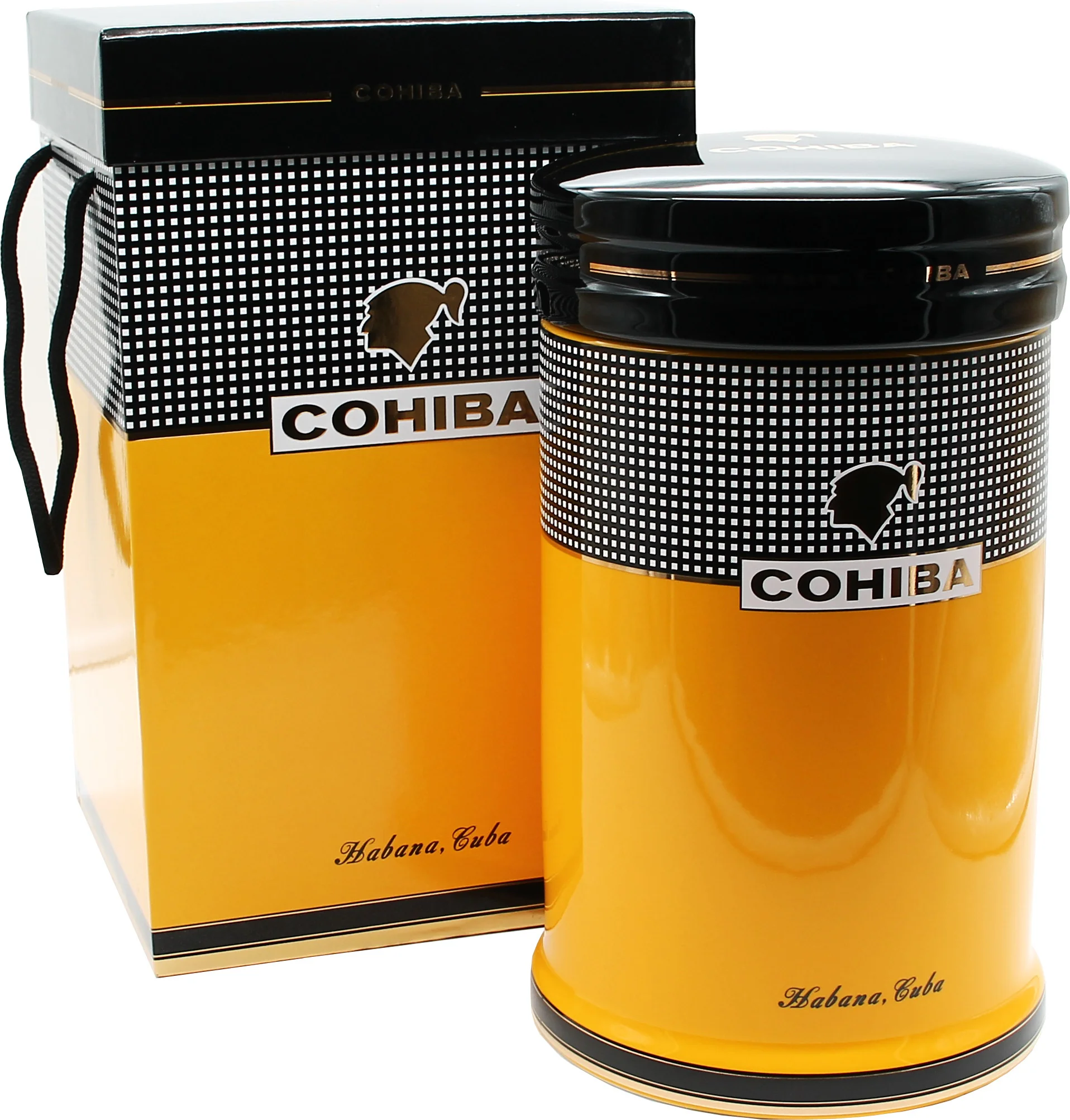 Der Cohiba Porzellanjar ist ein funktionales und zugleich ansprechend gestaltetes Aufbewahrungsgefäß der bekannten kubanischen Zigarrenmarke Cohiba. Er präsentiert sich in den typischen Farben der Marke, bestehend aus Gelb, Schwarz und Weiß, die durch dezente goldene Verzierungen ergänzt werden. Das Zusammenspiel dieser Elemente sorgt für eine klare Wiedererkennbarkeit des Markenstils, ohne aufdringlich zu wirken.