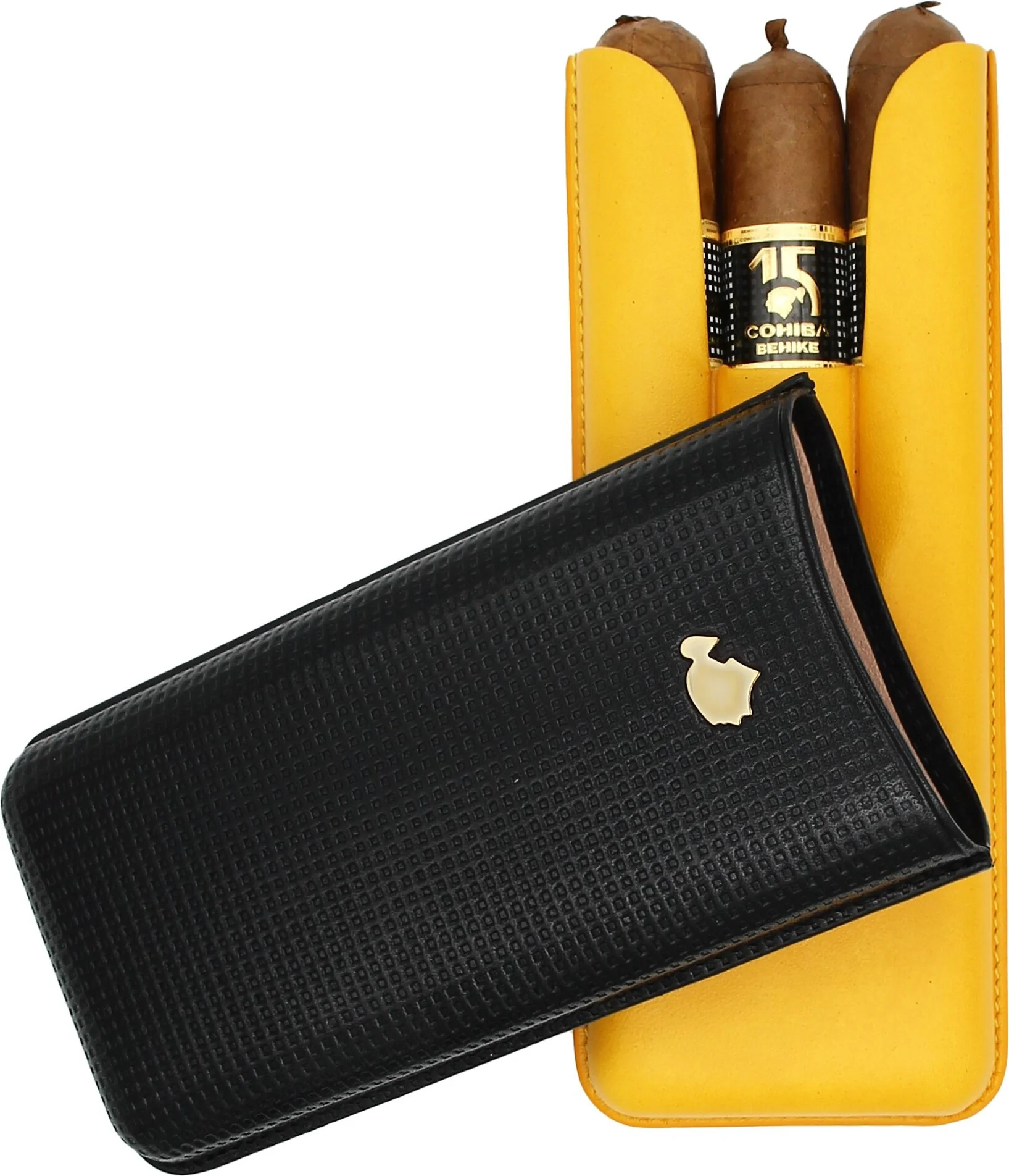 Das auffällige Zigarrenetui aus echtem, spanischem Leder fällt sofort durch seine zweifarbige Gestaltung in Gelb und Schwarz ins Auge, die Kenner sofort als Hommage an die berühmte Zigarrenbanderole der Marke erkennen. Der obere, schwarze Teil des Etuis ist mit einem strukturierten Gitter verziert, das dem bekannten, quadratischen Muster der Cohiba-Zigarrenbanderole nachempfunden ist. Die ikonische Taino-Silhouette von Cohiba in Silber rundet das Etui mit einem Hauch von Eleganz ab.