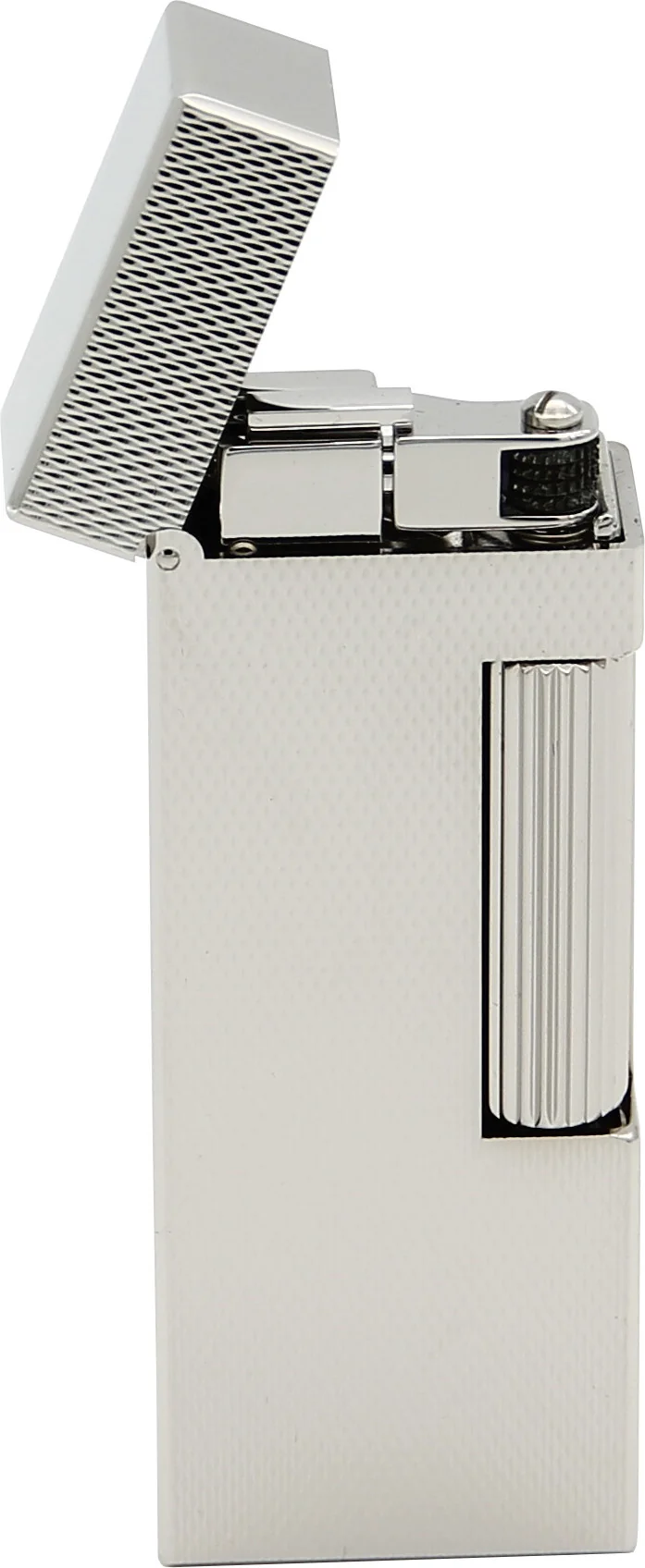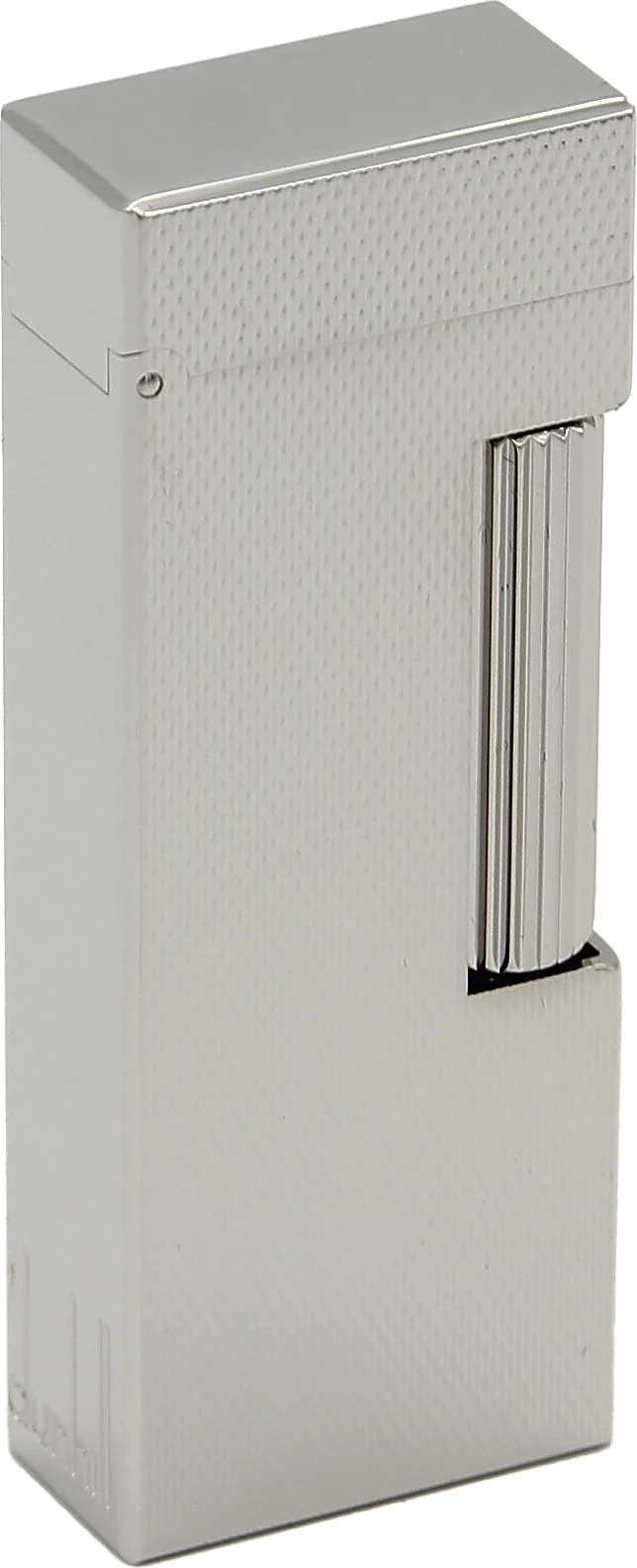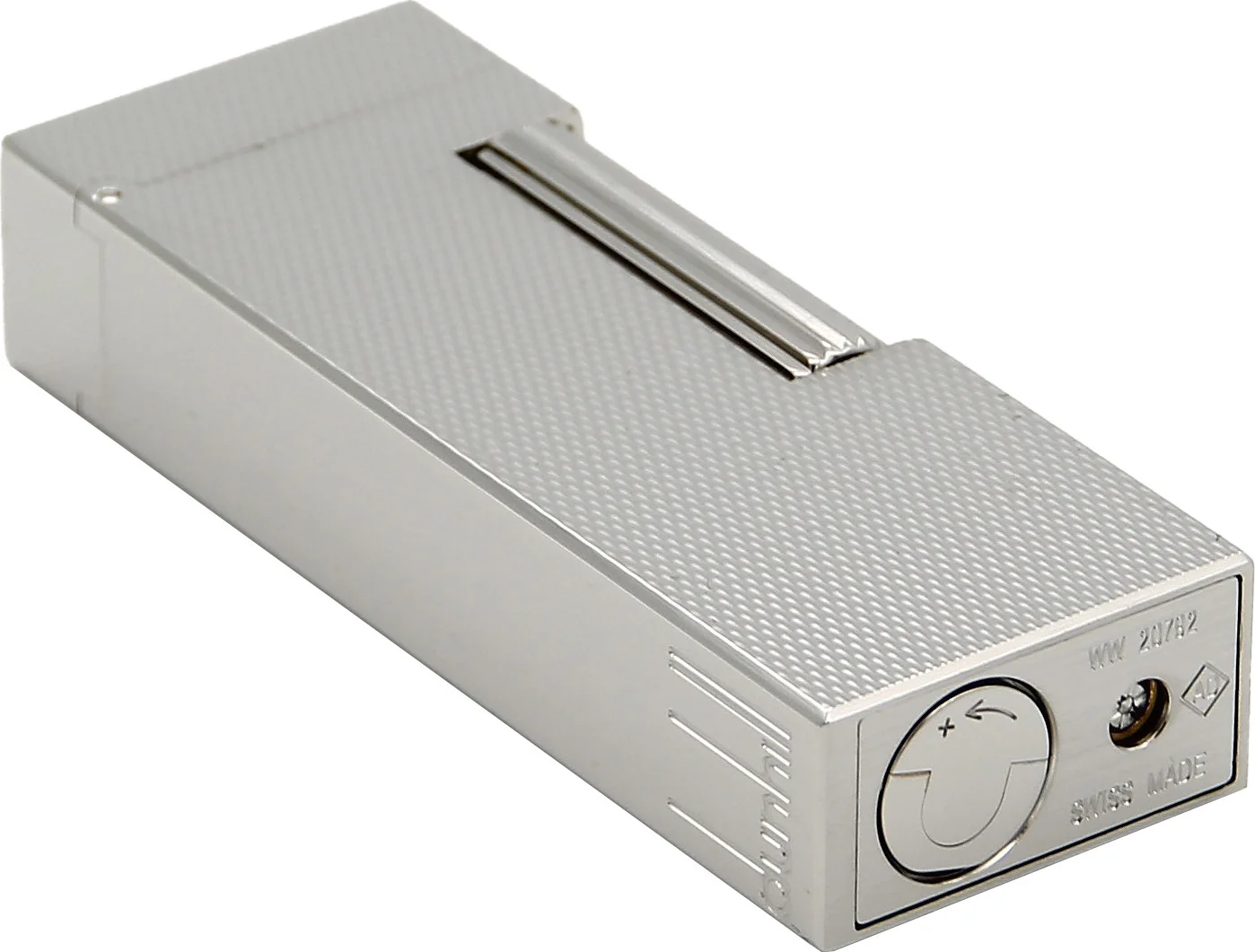 Die Kombination aus fein gemusterter Oberfläche auf der Vorder- und Rückseite sowie hochglanzpolierten, glatten Seitenteilen verleiht dem Feuerzeug seine elegante, unverwechselbare Optik. Auf einer Seite ist der Dunhill-Markenschriftzug fein eingraviert. Die Zündung wird durch einen Deckel vor Staub und Schmutz geschützt, was die Lebensdauer des Mechanismus zusätzlich erhöht.