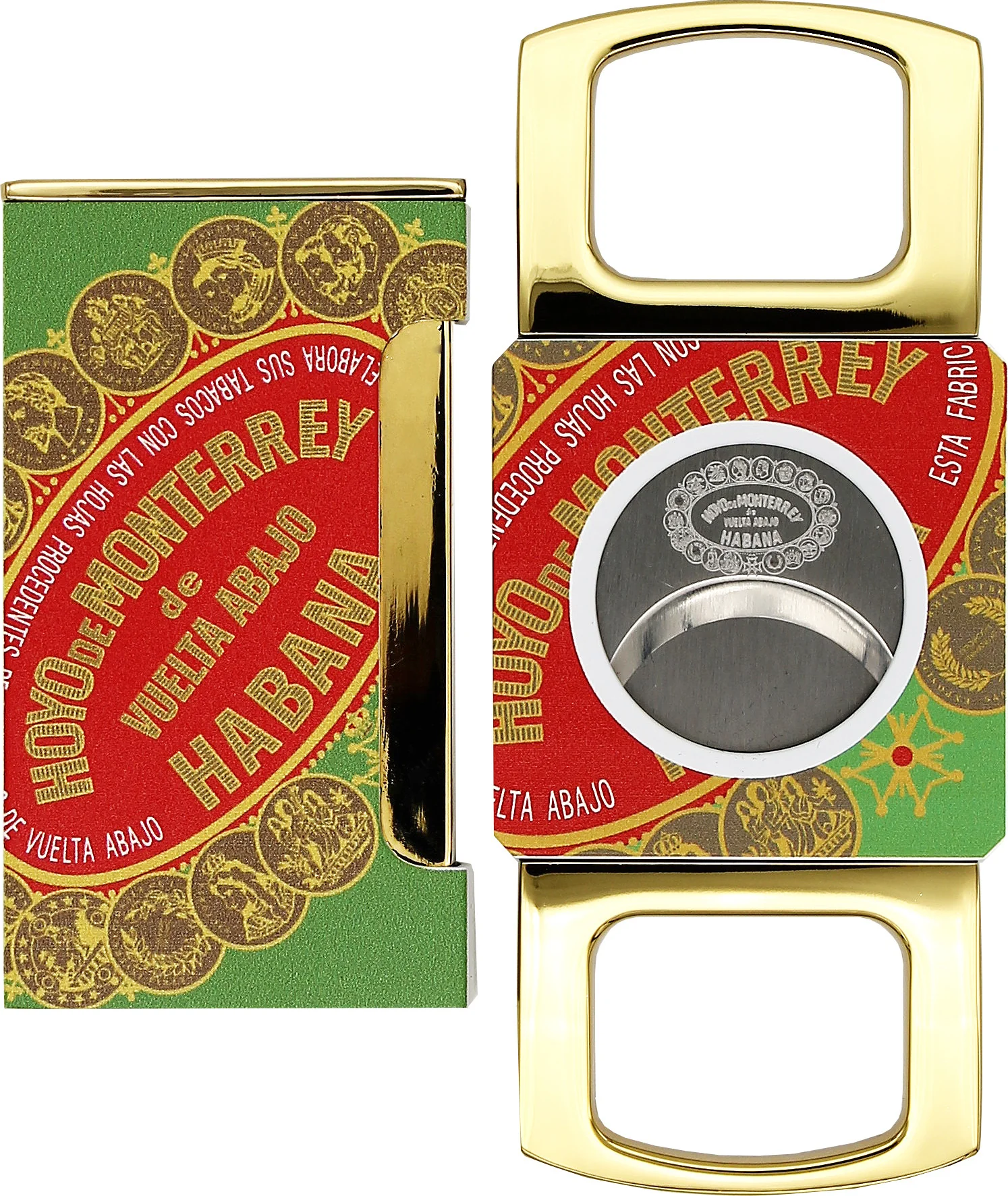 Die grünen und roten Hoyo de Monterrey-Motive werden durch glänzende goldene Akzente ergänzt, die sowohl Feuerzeug als auch Abschneider eine exklusive Ausstrahlung verleihen. Das Zusammenspiel aus Markenfarben, Gold und hochwertiger Verarbeitung macht dieses Set zu einem eleganten und modernen Begleiter für jeden Zigarrenliebhaber.