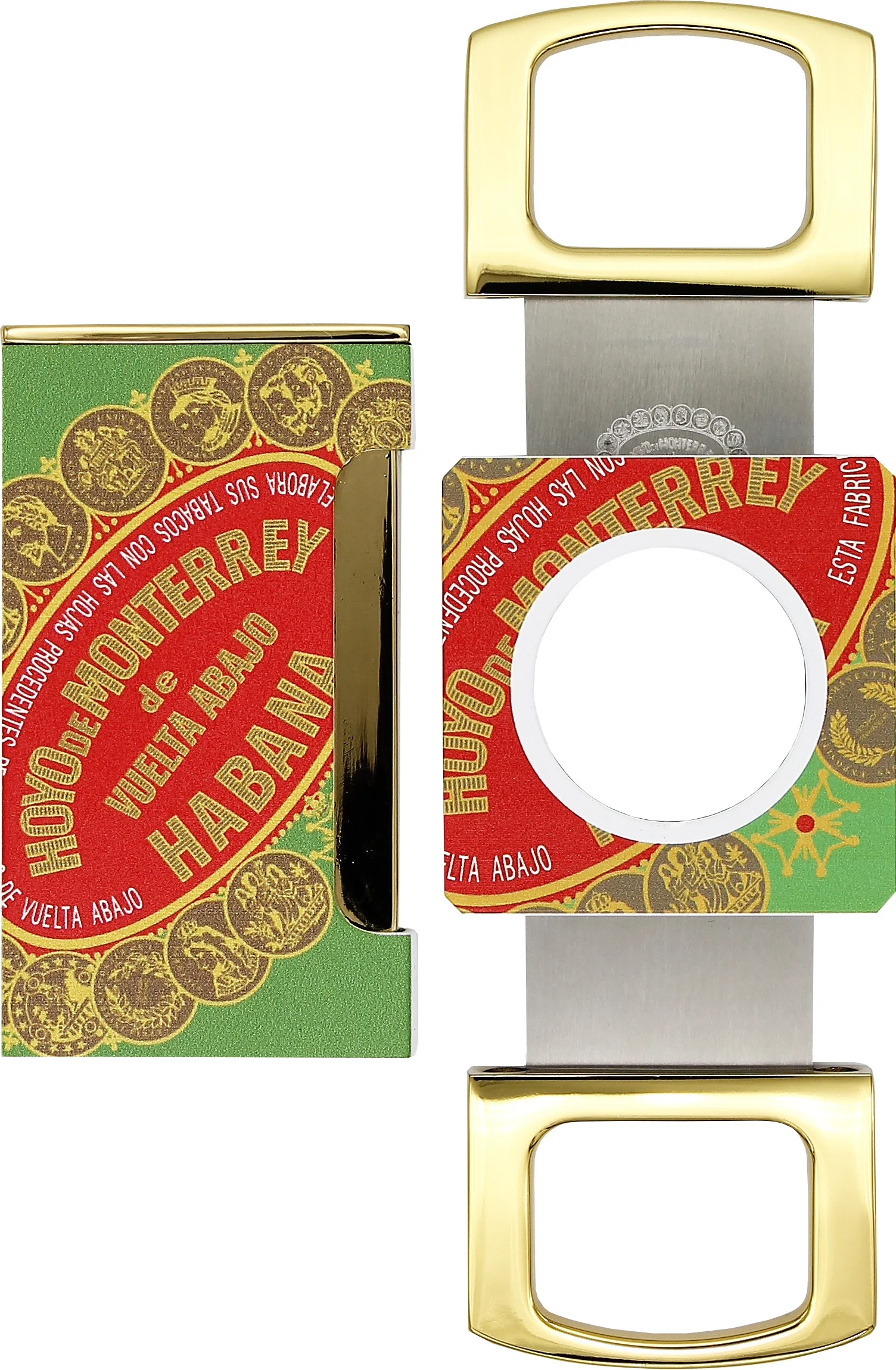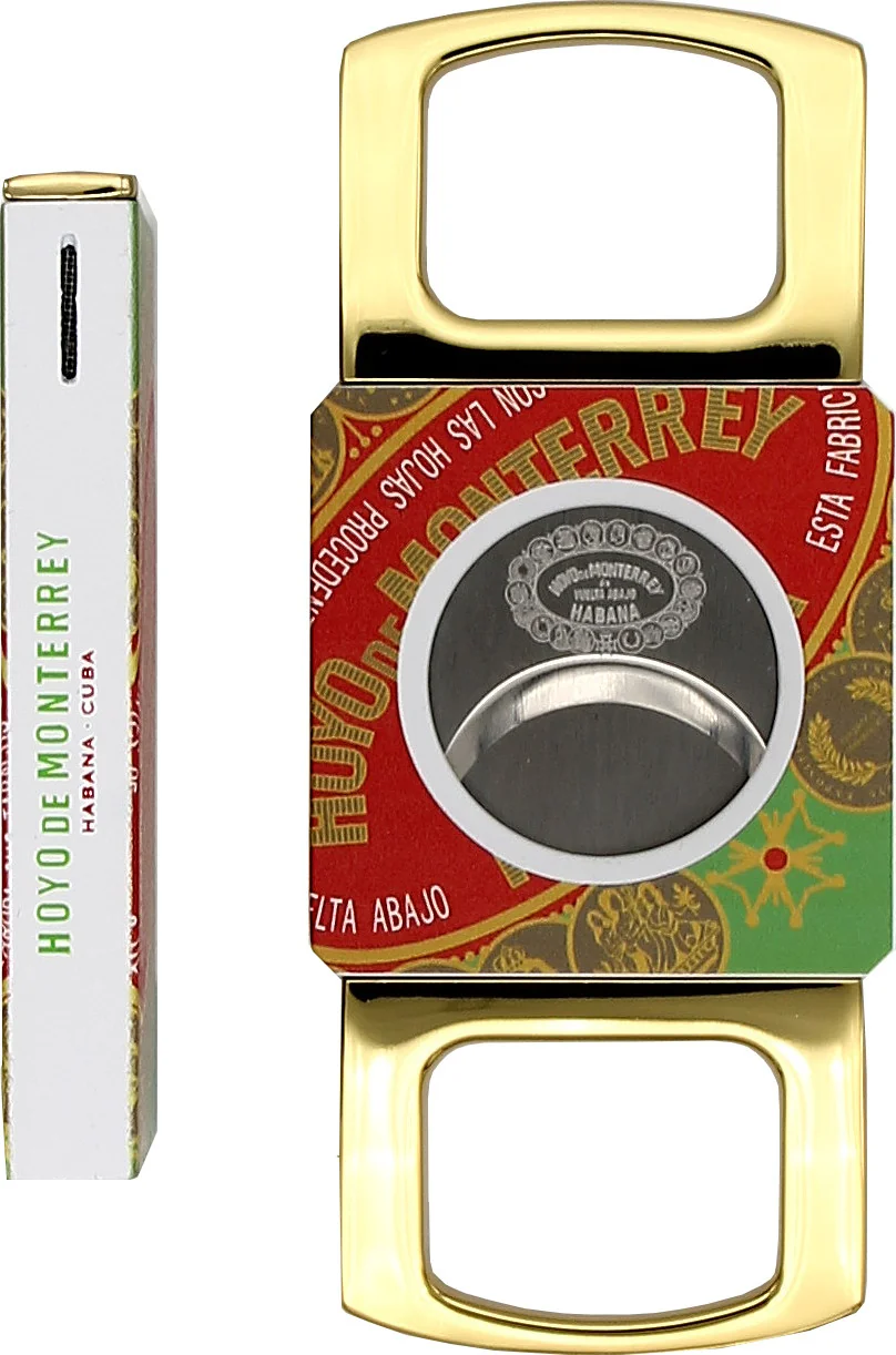 Der Doppelklingen-Zigarrenabschneider besitzt schräg geschliffene Edelstahlklingen, die ein sauberes und zuverlässiges Anschneiden der Zigarre ermöglichen. Eine der Klingen ist zusätzlich mit der Lasergravur des Hoyo de Monterrey Logos versehen und unterstreicht den hochwertigen Gesamteindruck.