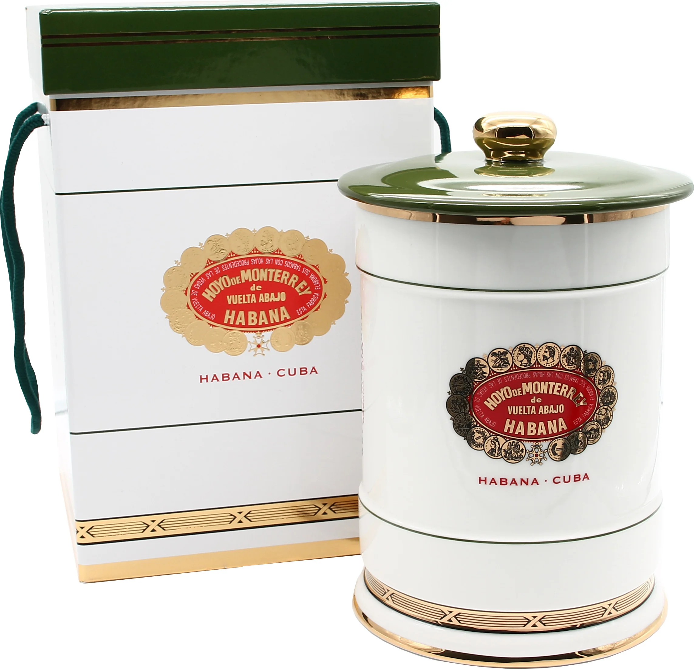 Das Hoyo de Monterrey Porzellanjar ist ein funktionales Aufbewahrungsgefäß für Zigarren der kubanischen Marke Hoyo de Monterrey. Es präsentiert sich in Weiß, Grün und goldenen Verzierungen, ergänzt durch das Hoyo de Monterrey Markenlogo auf der Front, das für die Wiedererkennbarkeit der Marke sorgt.