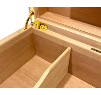 Auch andere Aspekte der Innenausstattung tragen zur Zuverlässigkeit und zum Stil eines jeden Humidors bei, darunter hochbelastbare Scharniere, die in der Regel aus Gold- oder Silberblech bestehen. Diese Scharniere sorgen für Langlebigkeit und einen reibungsloses Öffnen und Schließen des Deckels und tragen dazu bei, die perfekte Abdichtung zu gewährleisten. Viele Humidore von Elie Bleu sind mit attraktiven Schlössern und Schlüsseln ausgestattet, um die Sicherheit zu erhöhen, sowie mit Zedernholzfächern, um die Zigarren besser zu organisieren.
