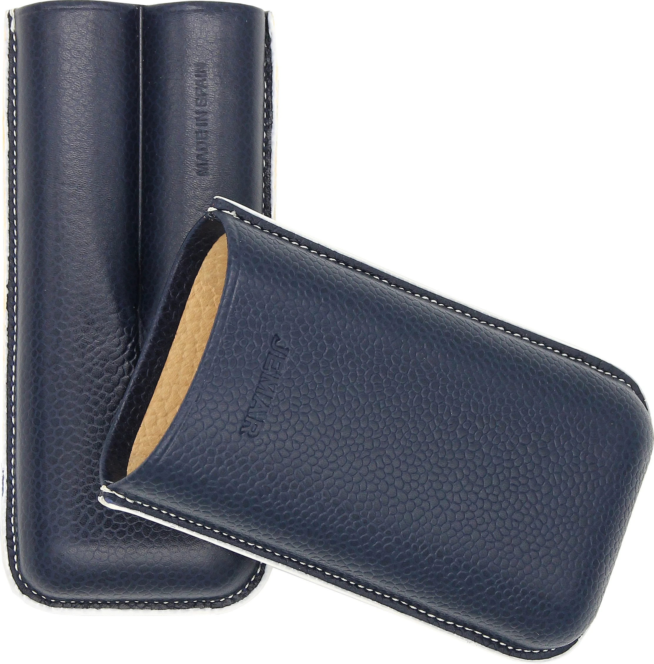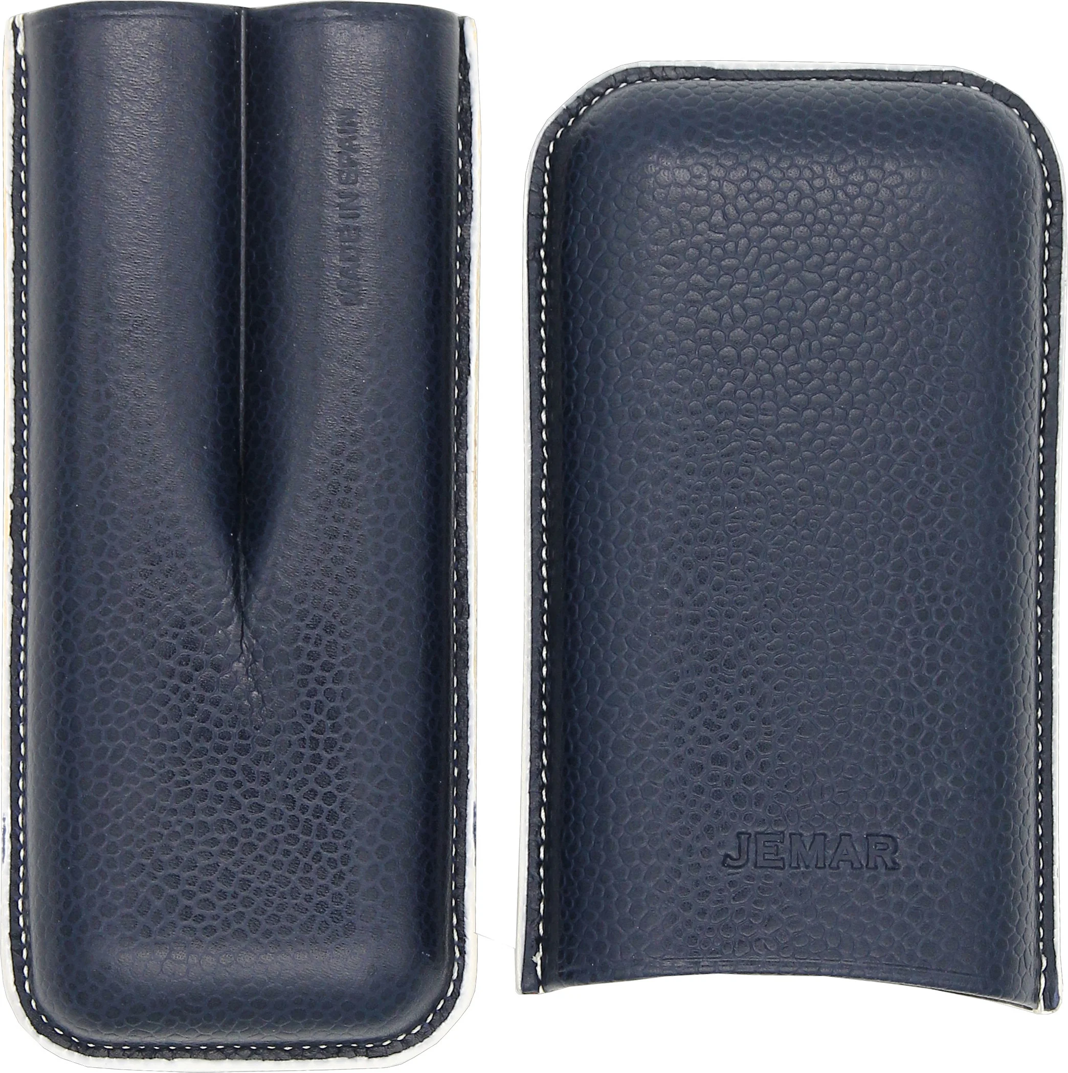Das Jemar Leder Zigarrenetui für zwei Zigarren ist ein stilvolles Accessoire für Aficionados, die Wert auf Qualität und Handwerkskunst legen. Gefertigt aus echtem Leder in zeitlosem Blauton mit heller Ziernaht und weißem Zierrand, überzeugt es durch Eleganz und Funktionalität. Innen ist das Etui mit hellem Glattleder ausgekleidet, was nicht nur für ein edles Erscheinungsbild sorgt, sondern auch zusätzlichen Schutz für die Zigarren bietet.