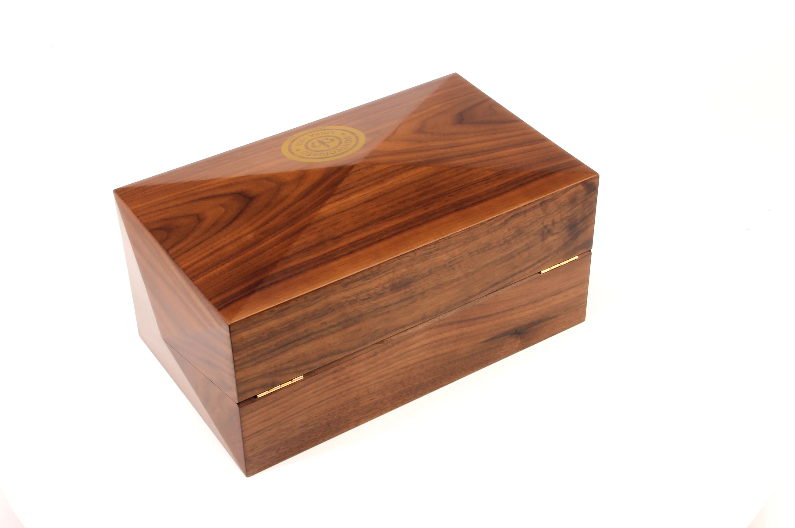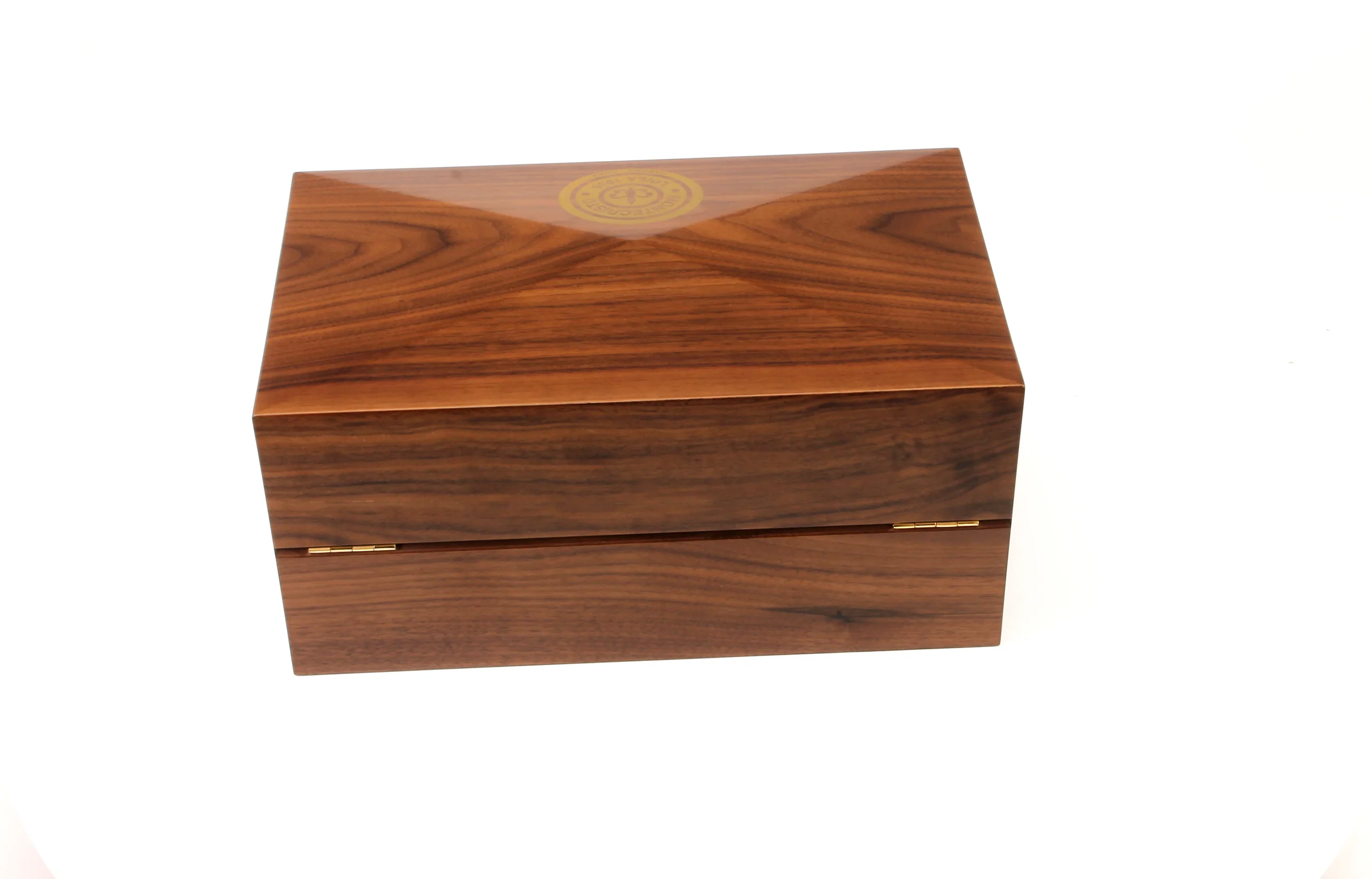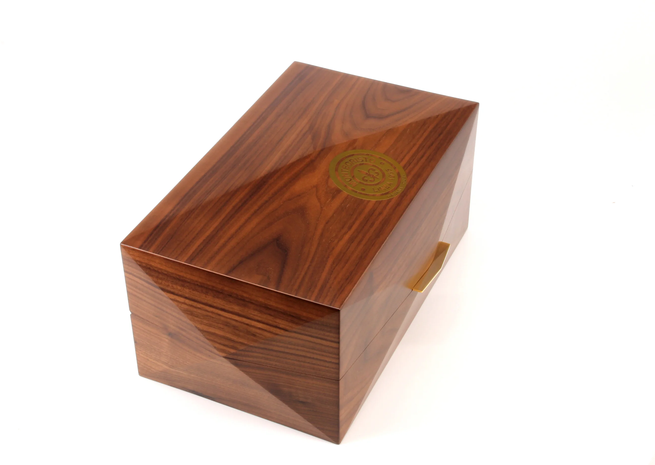 Dieser atemberaubende Humidor in limitierter Auflage wurde in Italien aus massivem Zedernholz gefertigt und ist ein robuster und langlebiger Blickfang in jedem Raum. Jede Seite des Humidors ist abgeschrägt und mit einem tiefbraunen Finish versehen, das an den Karmelit-Lack der Linea 1935 Zigarrenkisten erinnert. Ein goldfarbenes, rundes Montecristo-Logo prangt oben auf dem Deckel, der mit einem goldenen Griff leicht angehoben werden kann.