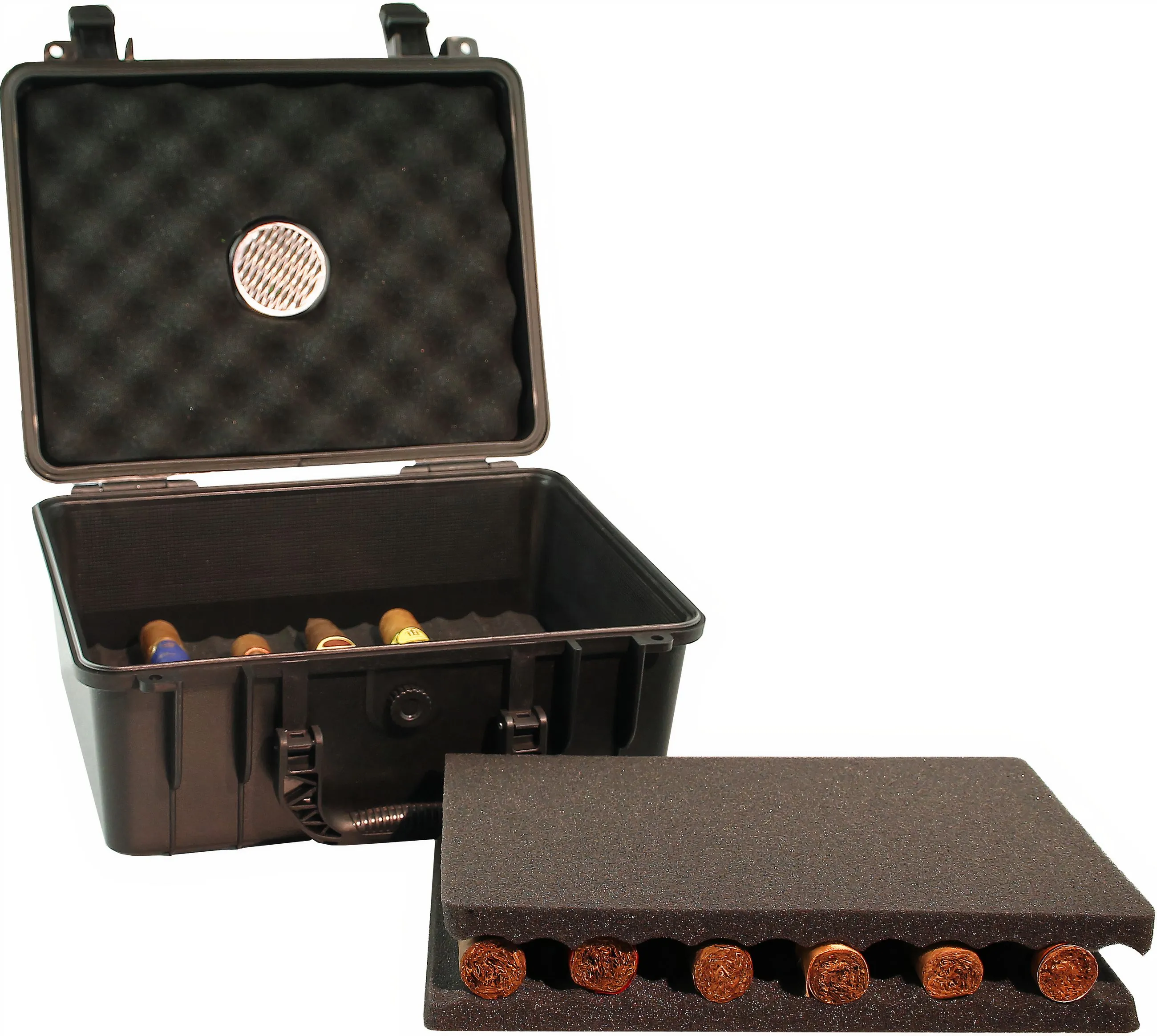 Hergestellt aus strapazierfähigem Hartplastik, erinnert der Humidor fast an einen Koffer. Er verfügt über einen robusten Griff und zwei Klappschließen, die ihn wasser- und luftdicht verschließen. Zusätzlich befindet sich vorne ein Druckausgleichsventil, das speziell für Flugreisen entwickelt wurde: Sollte sich der Humidor aufgrund des Luftdrucks nach einem Flug schwer öffnen lassen, ermöglicht dieses Ventil ein einfaches Ausgleichen des Drucks.