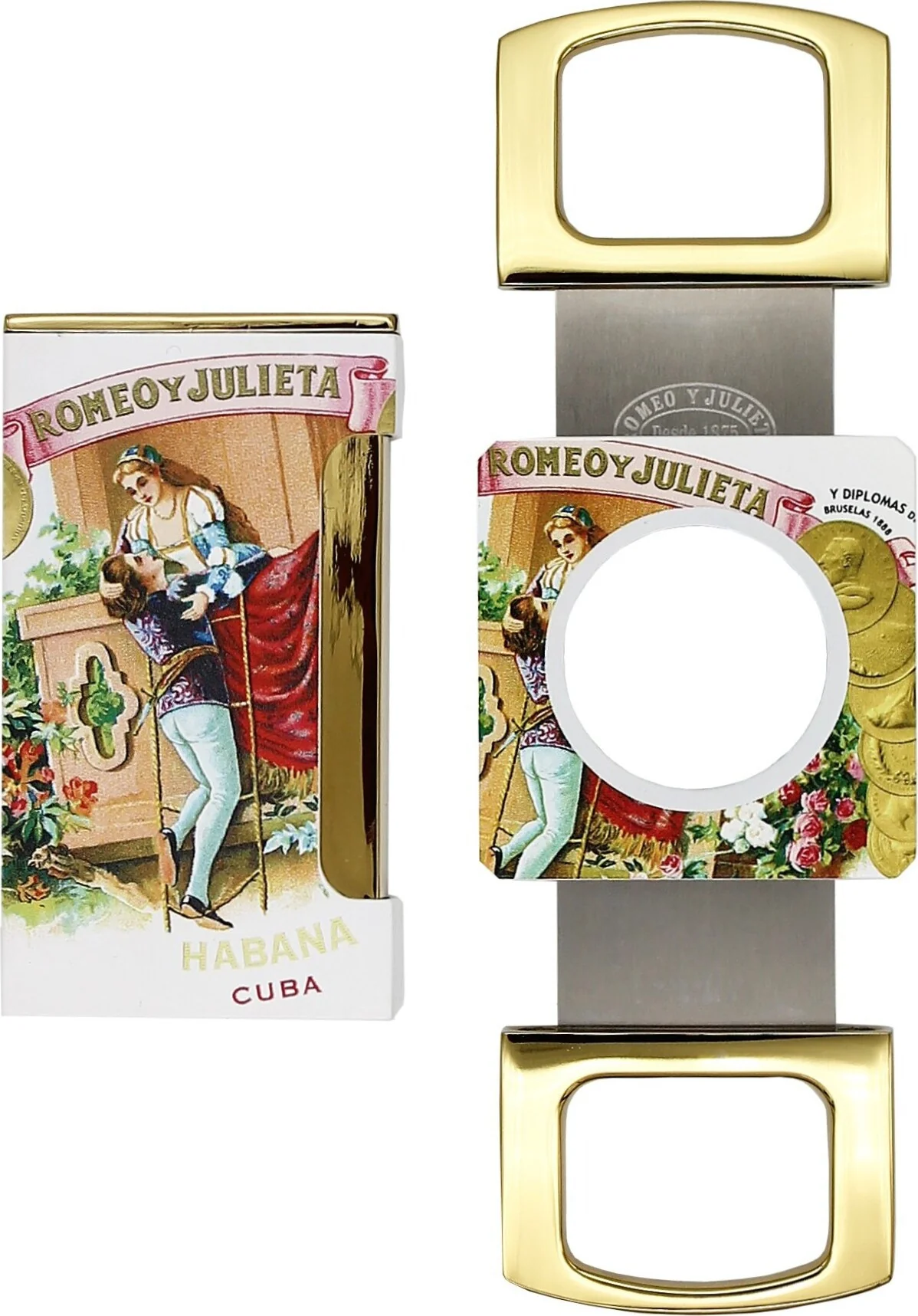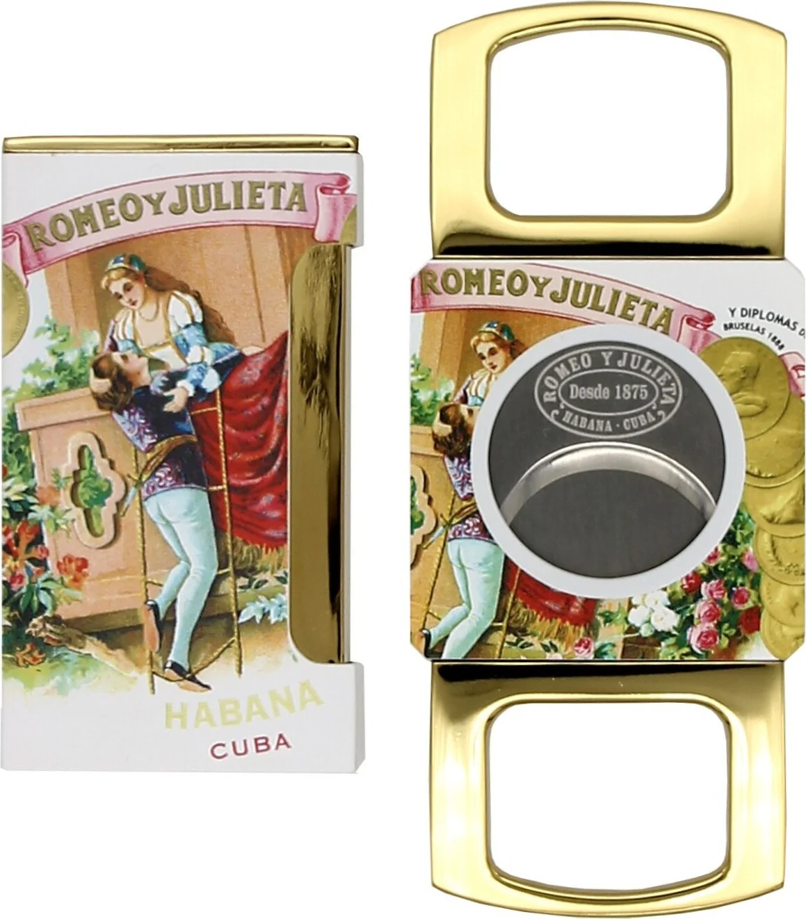 Der Doppelklingen-Zigarrenabschneider verfügt über schräg geschliffene Edelstahlklingen, die ein sauberes und zuverlässiges Anschneiden garantieren. Eine der Klingen trägt eine Lasergravur des Romeo y Julieta Logos.