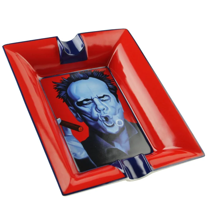 Siglo Aschenbecher Jack Nicholson ist ein auffälliger Zigarrenaschenbecher in leuchtendem Rot und Blau und zeigt das ikonische Bild von Jack Nicholson, der genüsslich Rauch-Ringe mit einer Zigarre in der Hand bläst. Nicholson, bekannt für seine langjährige Liebe zur Zigarre, verkörpert das genussvolle Rauchen wie kaum ein anderer. Dieser außergewöhnliche Aschenbecher ist ein echtes Statement-Piece und zieht die Aufmerksamkeit auf sich.