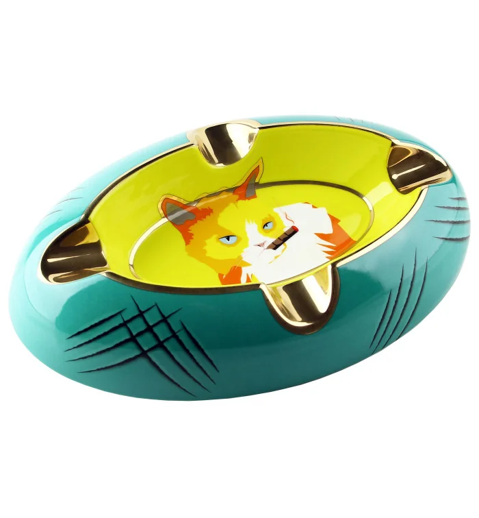 Siglo Aschenbecher Katze in Gelb/Grün ist ein auffälliger Zigarrenaschenbecher im ikonischen Pop-Art-Stil der Marke Siglo. Wer auf der Suche nach einem dezenten Ascher ist, wird hier nicht fündig – dieser Aschenbecher ist ein echtes Statement! Mit seiner lebhaften Farbkombination aus Türkis-Grün und Gelb sowie dem einzigartigen Motiv einer Zigarre rauchenden Katze zieht er garantiert alle Blicke auf sich. Vier großzügige Zigarrenablagen bieten stabilen Halt und freischwebende Lagerung für die Zigarre, ideal für den gemeinsamen Genuss.