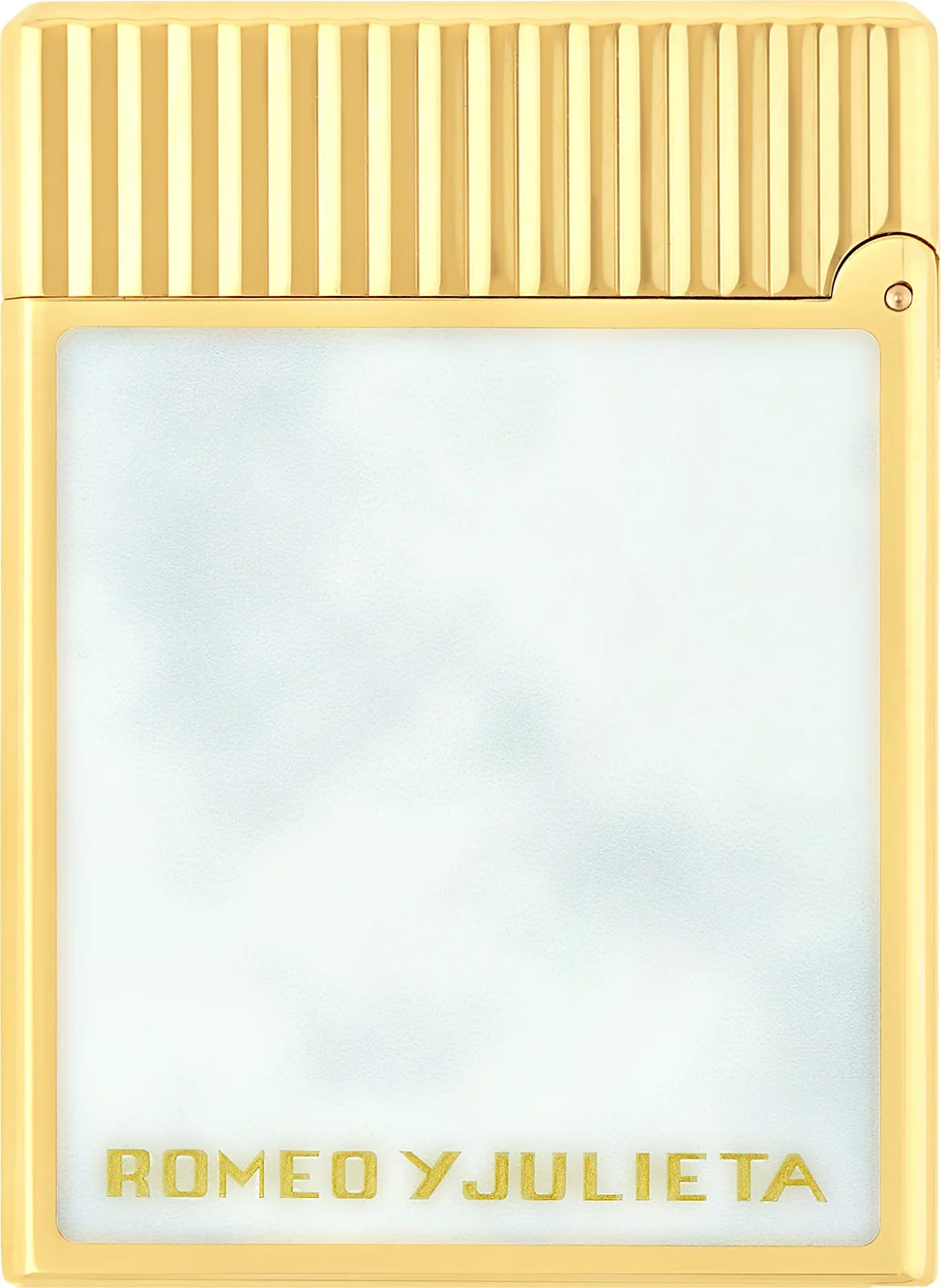 Die Front des Feuerzeugs wird von einer Reliefmedaille geschmückt, die die berühmte Balkonszene von Romeo und Julia zeigt, ein Sinnbild für Liebe und Leidenschaft. Rund um das Medaillon findet sich weißer Lack, der sich auch auf der Rückseite wiederholt. Dort befindet sich zudem der elegante „Romeo y Julieta“-Schriftzug.