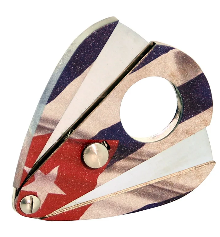 Ein eleganter, tropfenförmiger Zigarrenabschneider mit dem beeindruckenden Motiv der wehenden kubanischen Flagge auf Vorder- und Rückseite. Dieser Abschneider kombiniert stilvolles Design mit höchster Funktionalität und ist ein ideales Accessoire für Liebhaber kubanischer Zigarren.